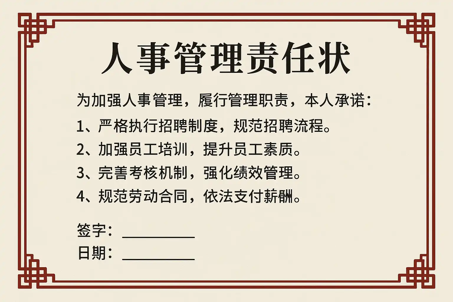 以上内容可直接用于起草与评审“人事管理责任状”,并结合企业规模与行业特性适配优化,确保既能支撑业绩,又能守住合规底线。