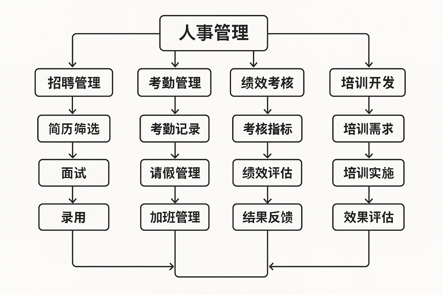 - 招聘与录用:需求审批—职位开放—候选池—面试—录用—Offer签署—入职材料。