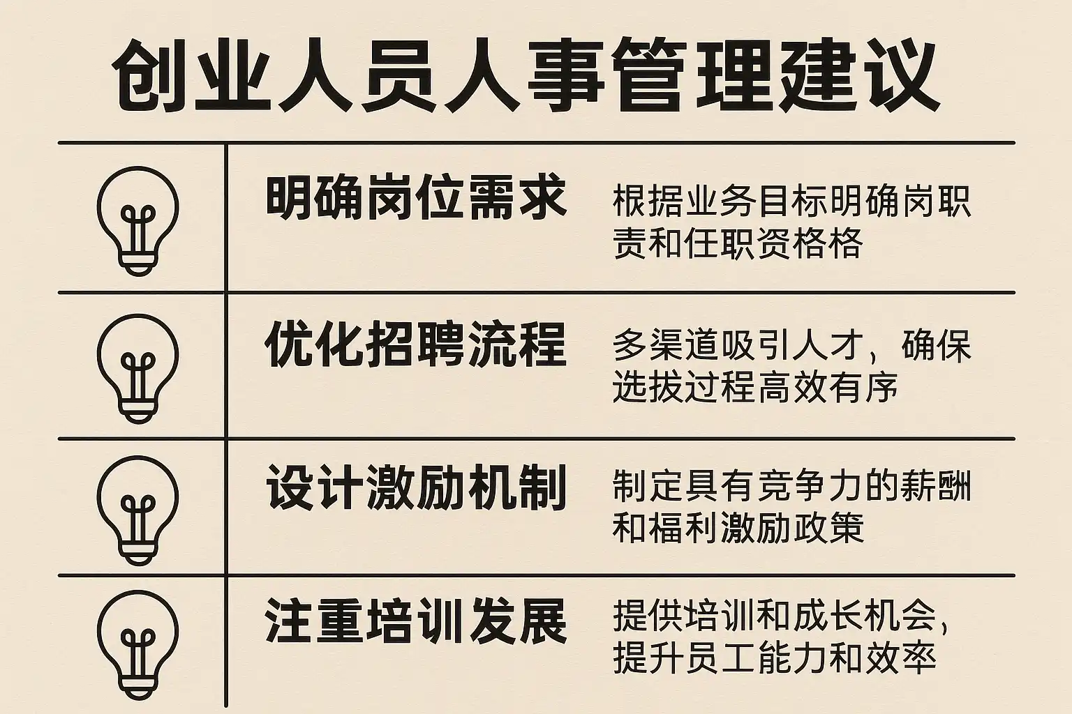 科学的人事管理是提升创业团队效率的关键,主要包括明确岗位职责、优化招聘流程、实施绩效考核和员工激励机制。具体做法: