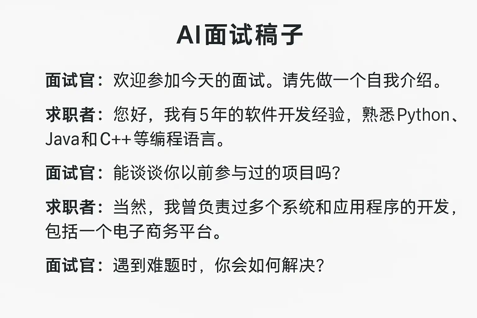 AI面试稿子模板核心内容通常包括自我介绍、职业经历、项目案例、技能展示和常见面试问题回答。以下是模板常见结构示例: