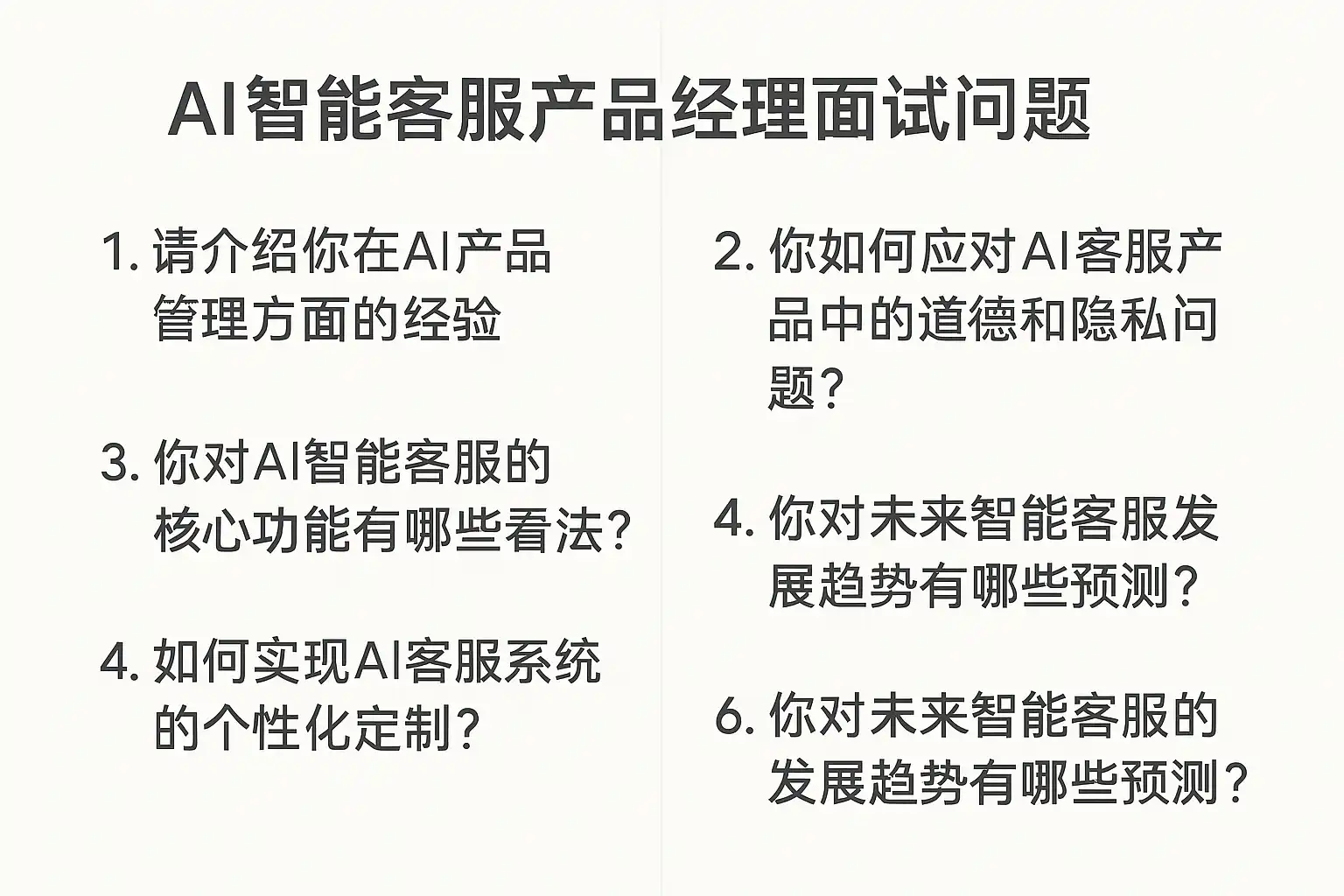 - 产品理解与设计能力:考察对AI智能客服产品功能、架构及用户需求的理解。