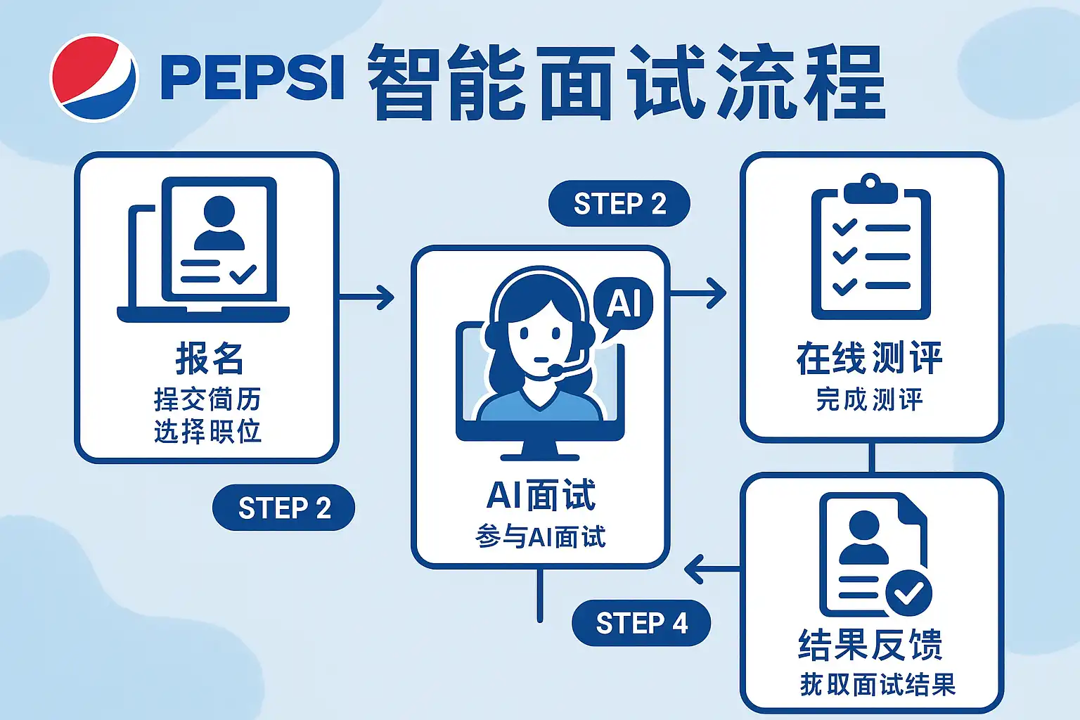 基于公开信息与大型快消企业(含百事等)通行实践,AI智能面试流程通常呈现以下路径(不同岗位会有差异):