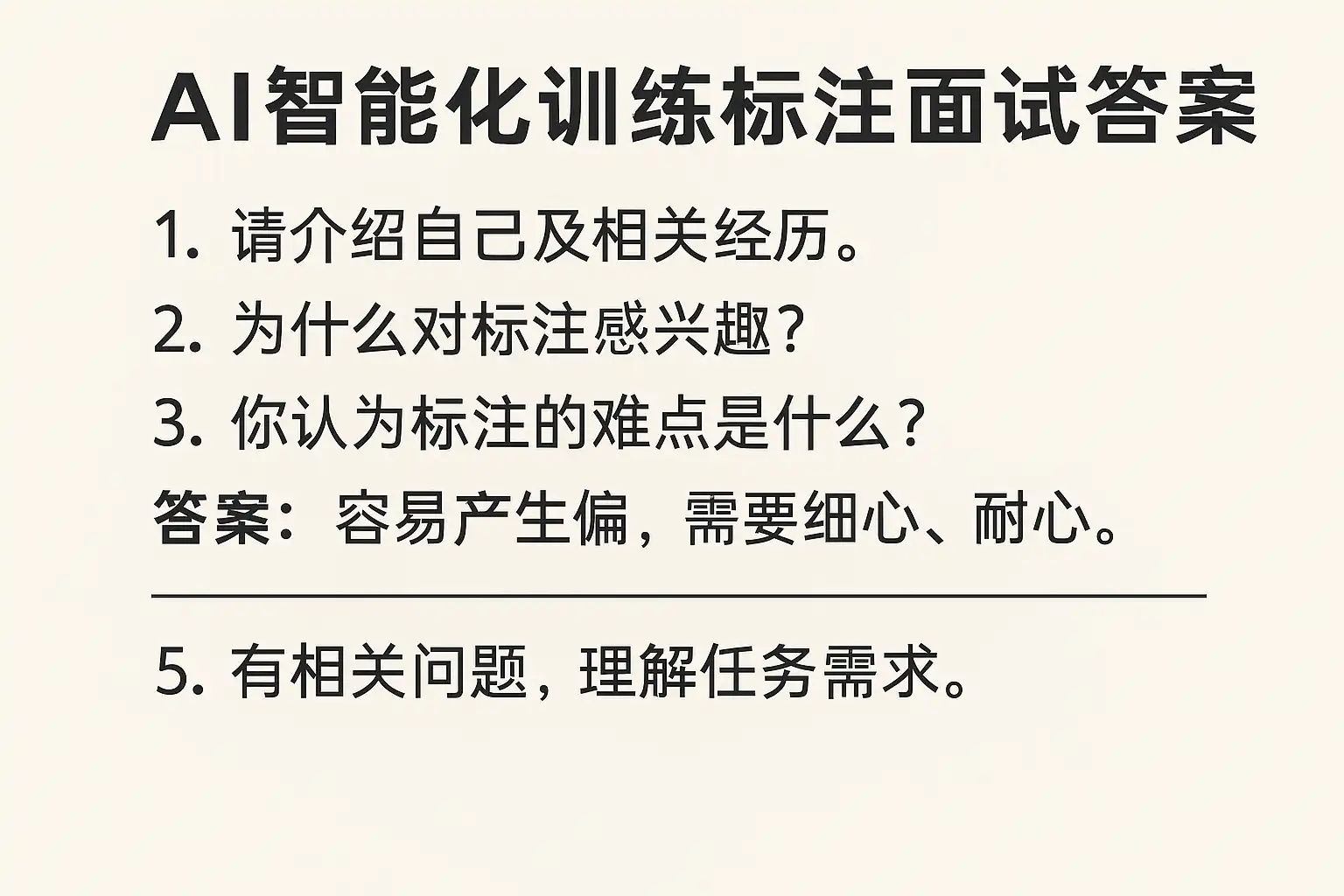 我即将参加AI训练标注岗位的面试,不太确定面试官会重点考察哪些方面,想知道如何系统准备面试答案?