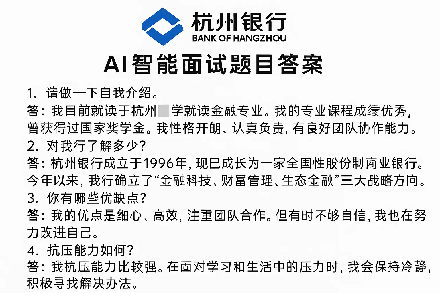 《杭州银行AI智能面试题目答案解析,杭州银行AI面试难吗?》