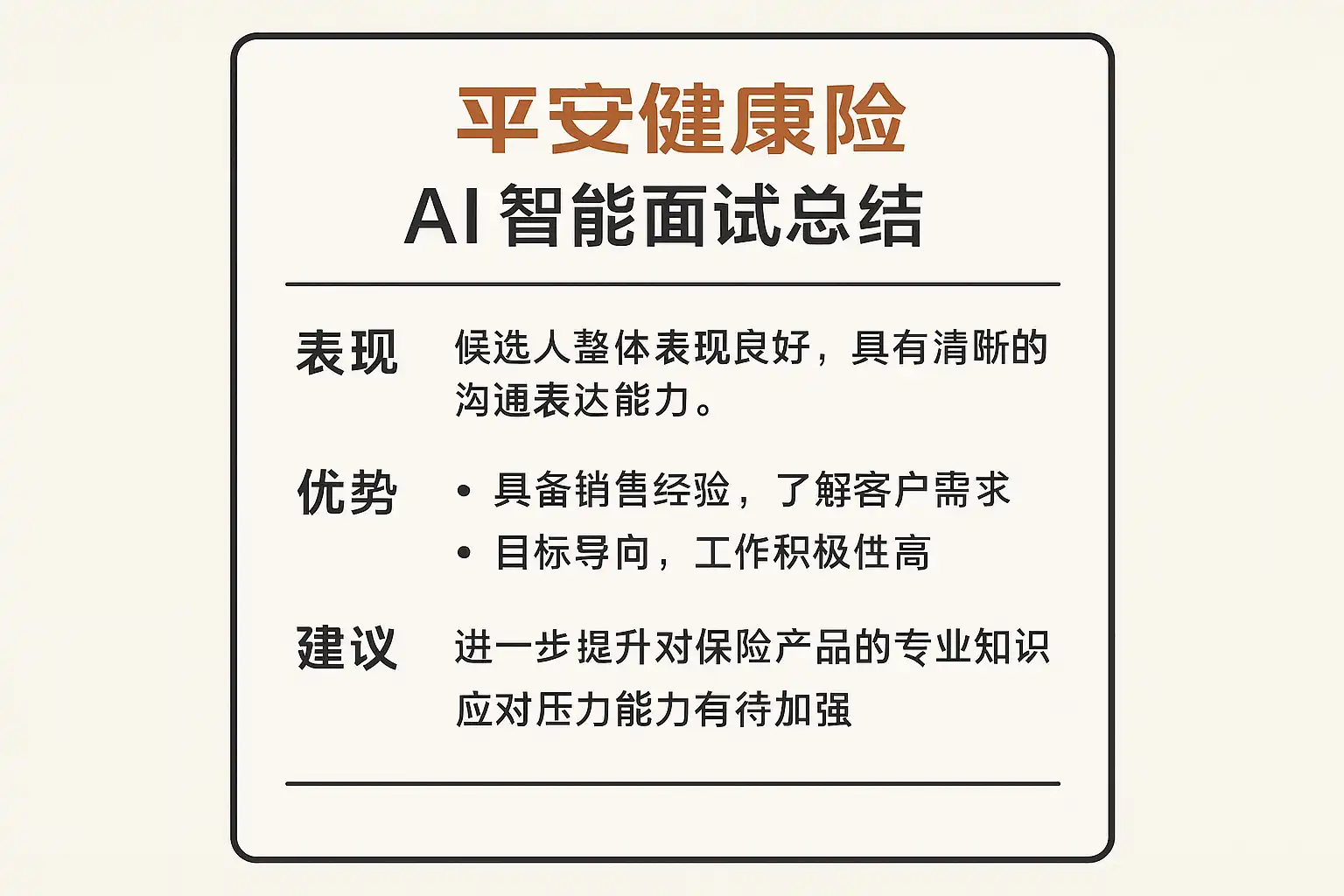 这种结构不仅适用于平安健康险的 AI 智能面试总结,也能推广到其他类似的线上面试复盘中。