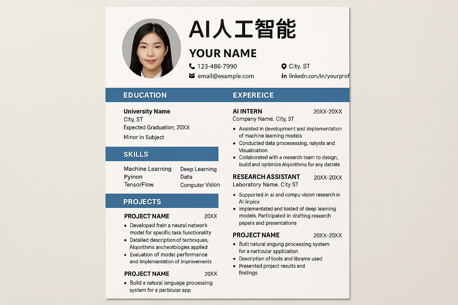 - 技能关键词自然融入:如机器学习、深度学习、Python、TensorFlow等,确保简历通过自动筛选系统(ATS)。