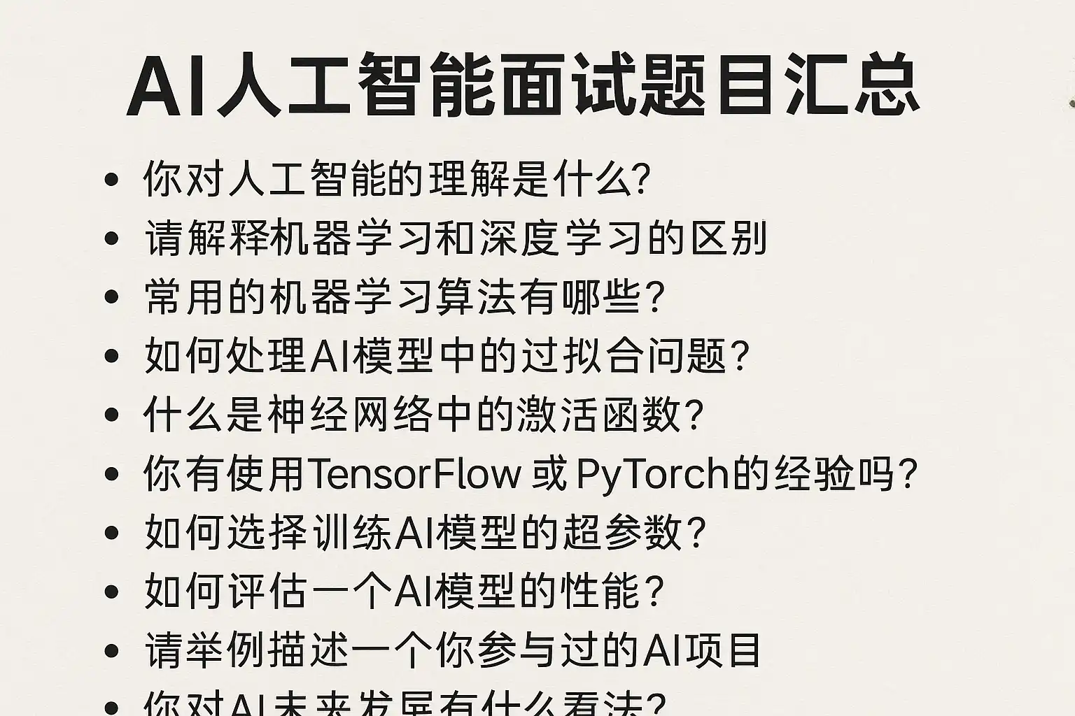 在AI人工智能面试中,题目通常涵盖多个维度,既包括计算机科学基础,也涉及行业实践与应用。为了便于求职者系统备考,我们将题目分类如下: