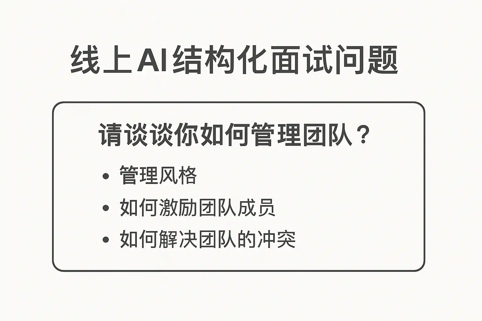 | 线上AI结构化 | 标准化强、效率高、可复用题库、可规模化评估 | 人情味弱、对设备与表达依赖高 | 校招初筛、大量岗位统一评估 |