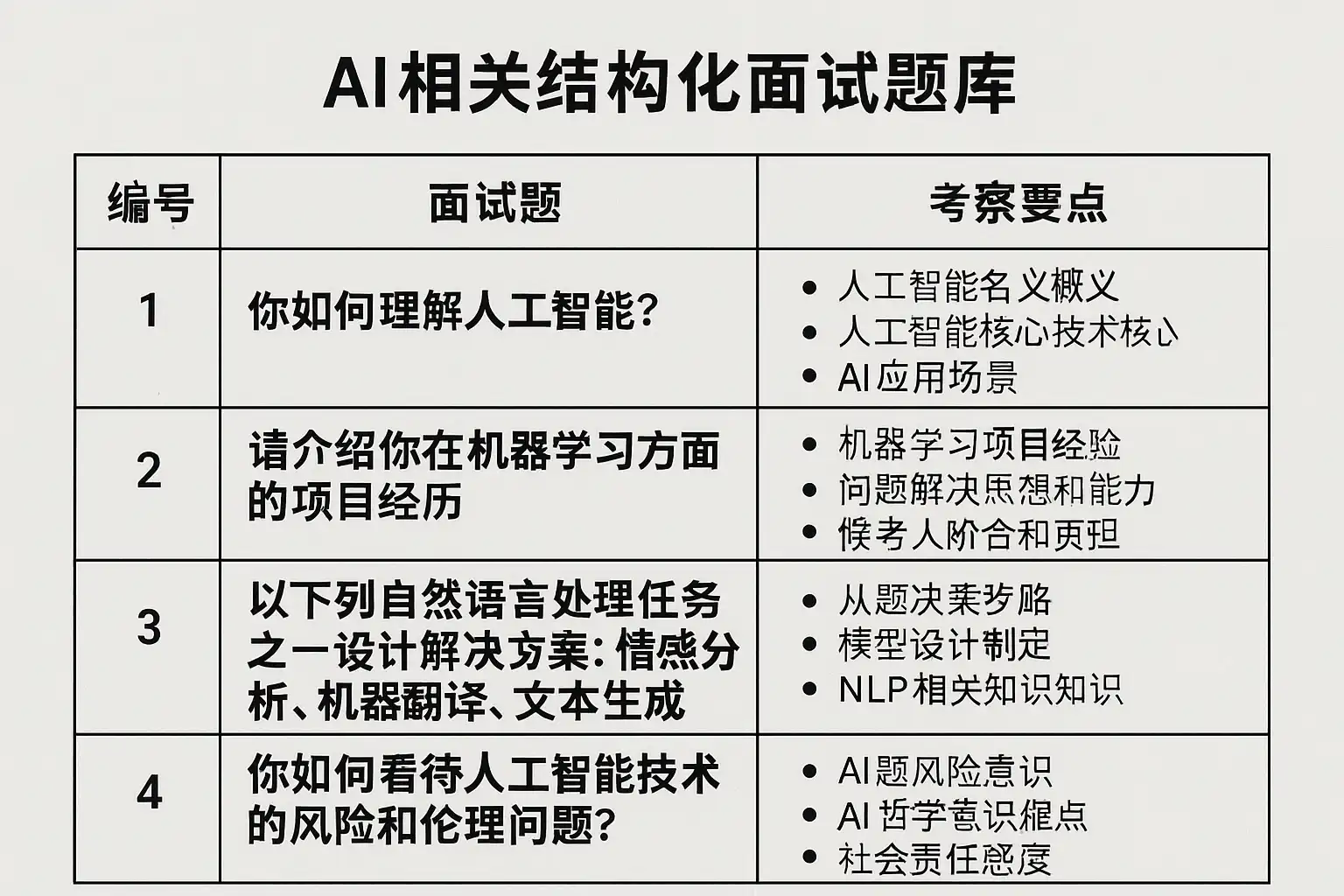 结构化面试(Structured Interview)是一种基于统一题库和评分标准的面试方式,主要为了提升招聘的公平性和准确性。对于AI相关岗位而言,它不仅考察候选人的理论知识,还关注解决问题的思路、沟通能力和项目落地能力。