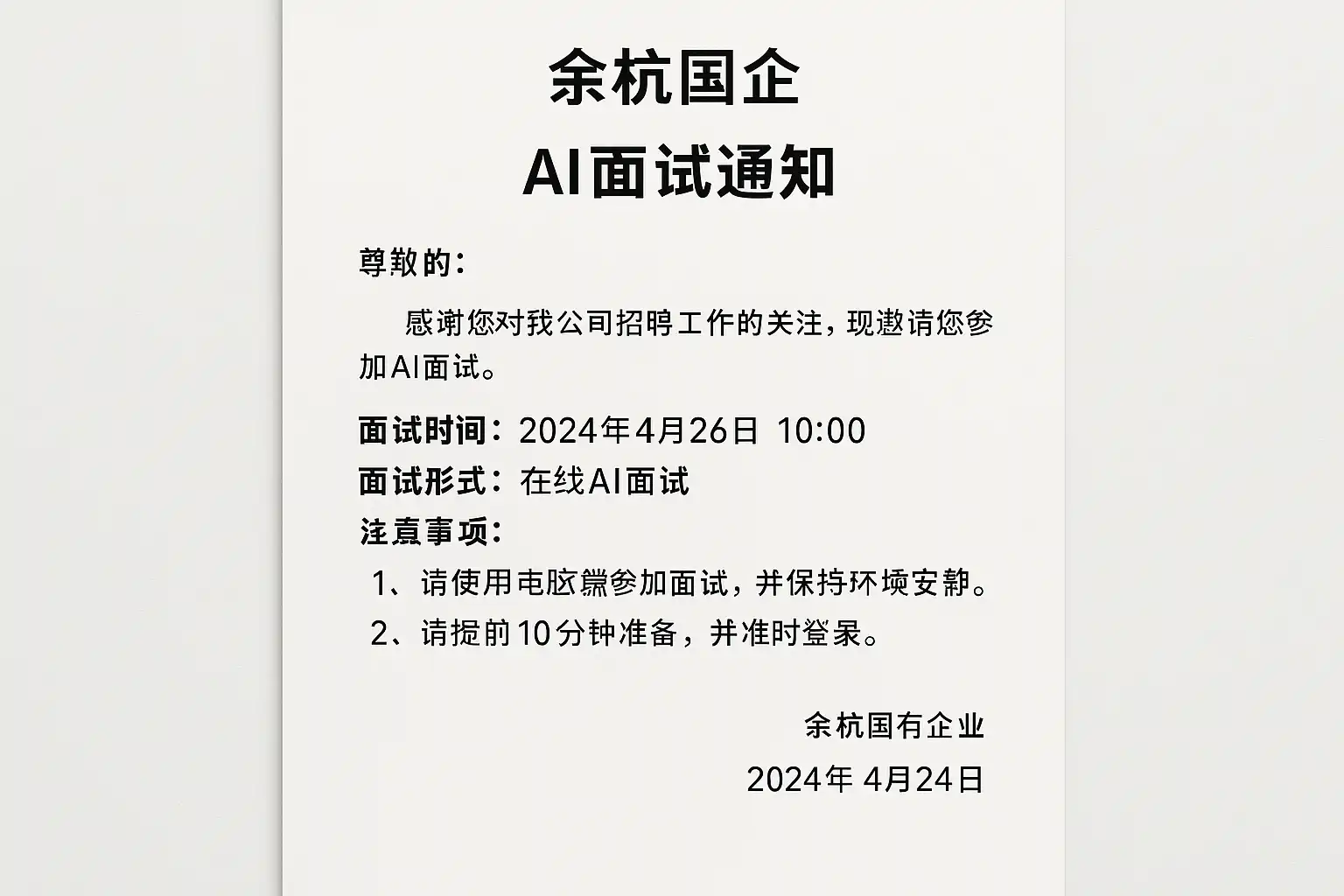 余杭国企AI面试通知,面试流程有哪些注意事项?