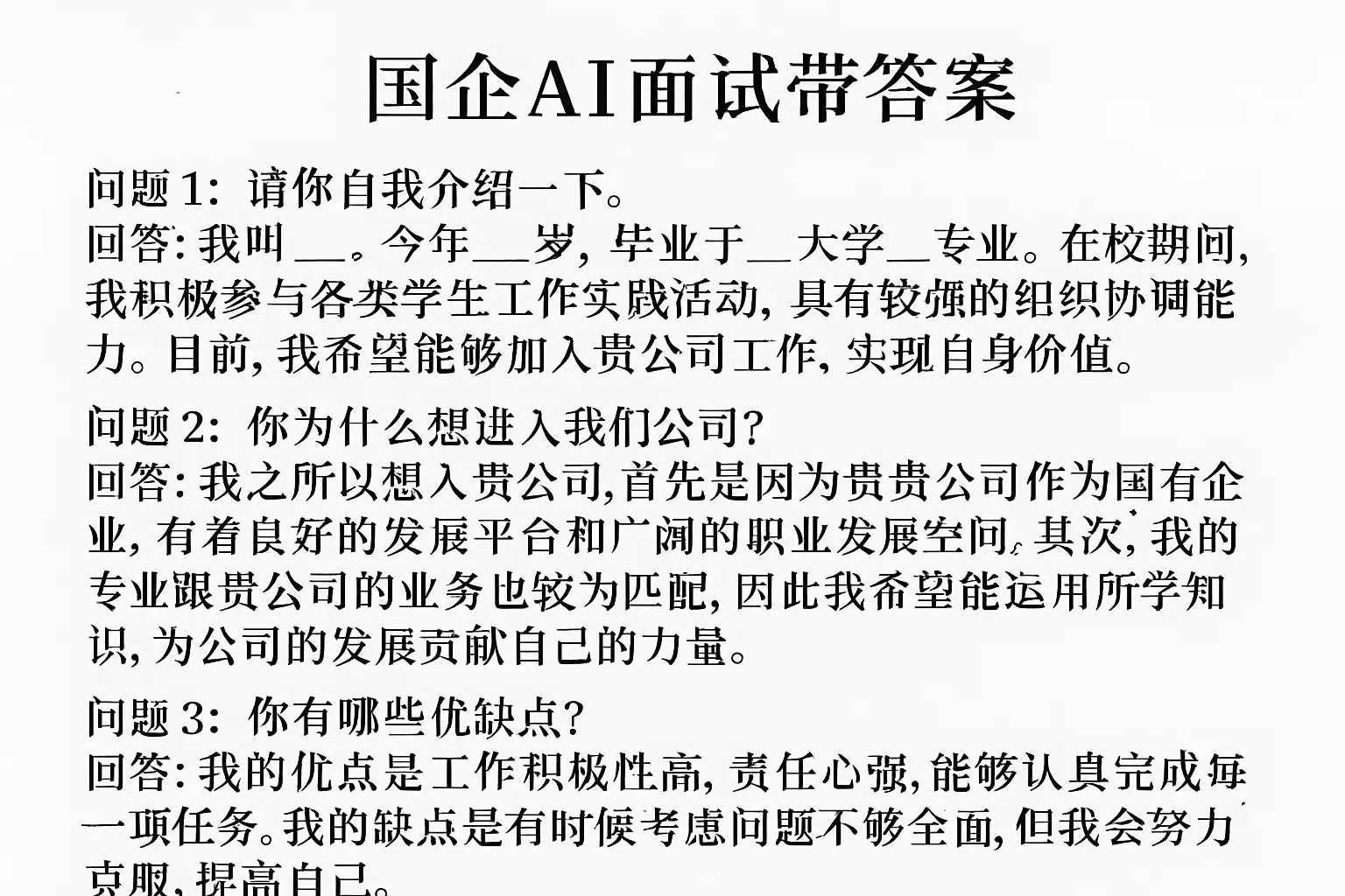 如果你愿意,我还可以为你提供一份国企AI面试高分模拟训练题库,并配合解析,让你在短期内提升匹配度评分。你需要我帮你制作这份专项训练题库吗?