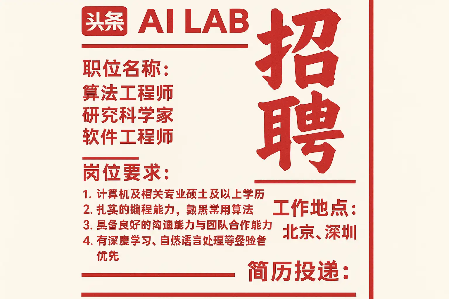 我最近关注头条AI Lab的招聘动态,想了解最新的职位信息和招聘要求,方便我有针对性地准备。请问头条AI Lab目前招聘哪些岗位?有什么具体的招聘条件?
