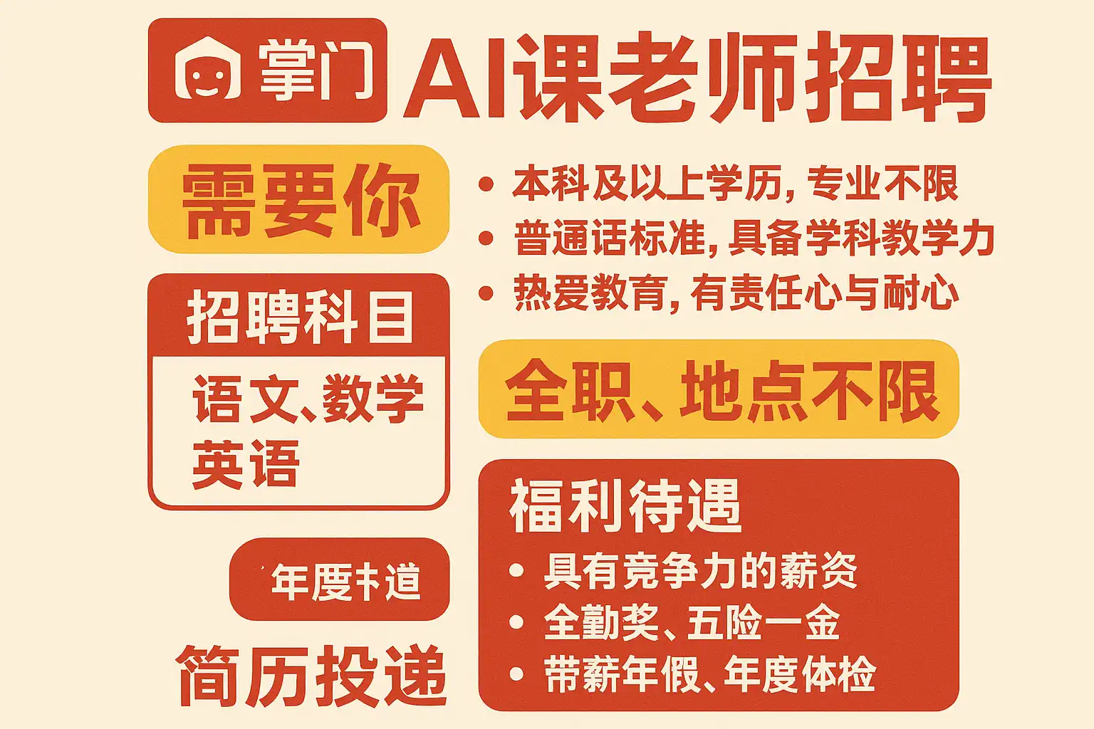 掌门AI课老师招聘最新信息显示,关键要求包括:
