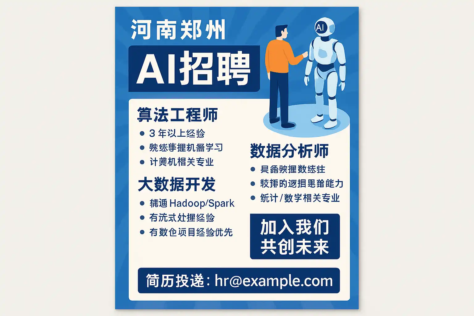 河南郑州AI招聘最新机会主要集中在以下几个领域: