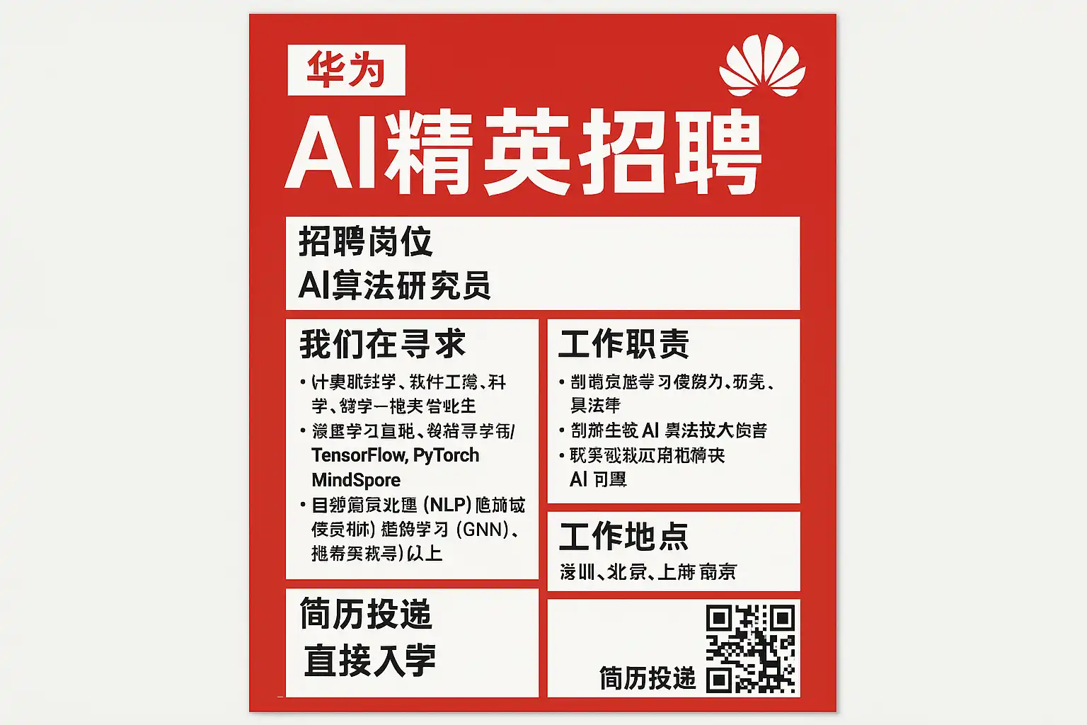 - 招聘时间节点:华为一般在每年3月和9月启动AI精英招聘,提前1-2个月关注官网及官方招聘平台。