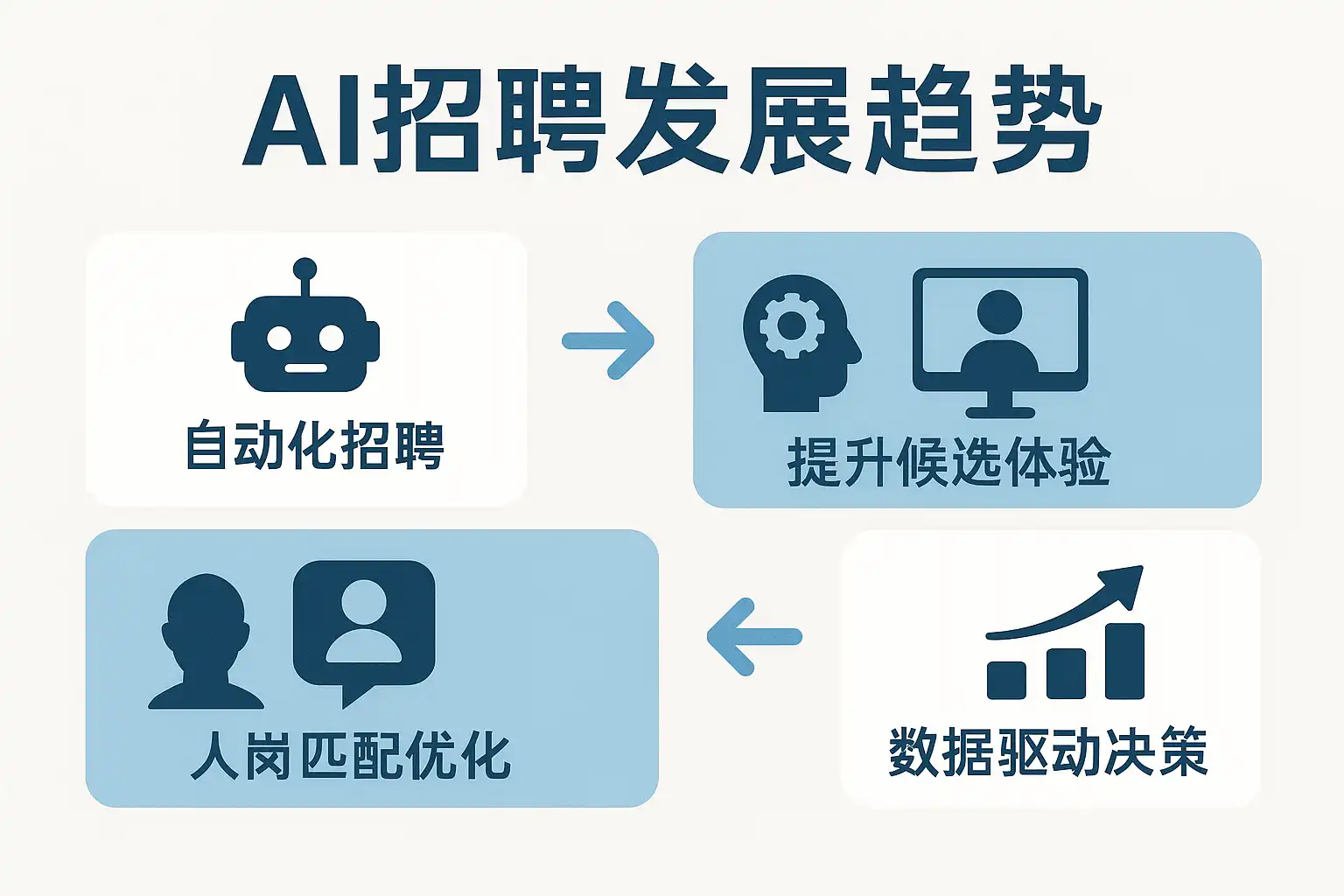 AI招聘发展趋势主要表现在自动筛选简历、智能面试辅助和大数据分析三个方面。根据LinkedIn 2023年报告,采用AI招聘工具的企业招聘效率提升了35%,岗位匹配准确率提高了25%。这些技术使得招聘流程更加高效和精准,同时也促使求职者必须提升数字技能以适应新环境。未来就业将更加注重数据分析能力和跨领域复合技能。