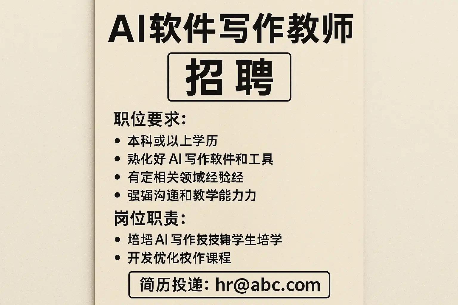 - 岗位要求:掌握主流AI写作工具(如GPT、BERT等)、具备教学经验和软件应用能力。