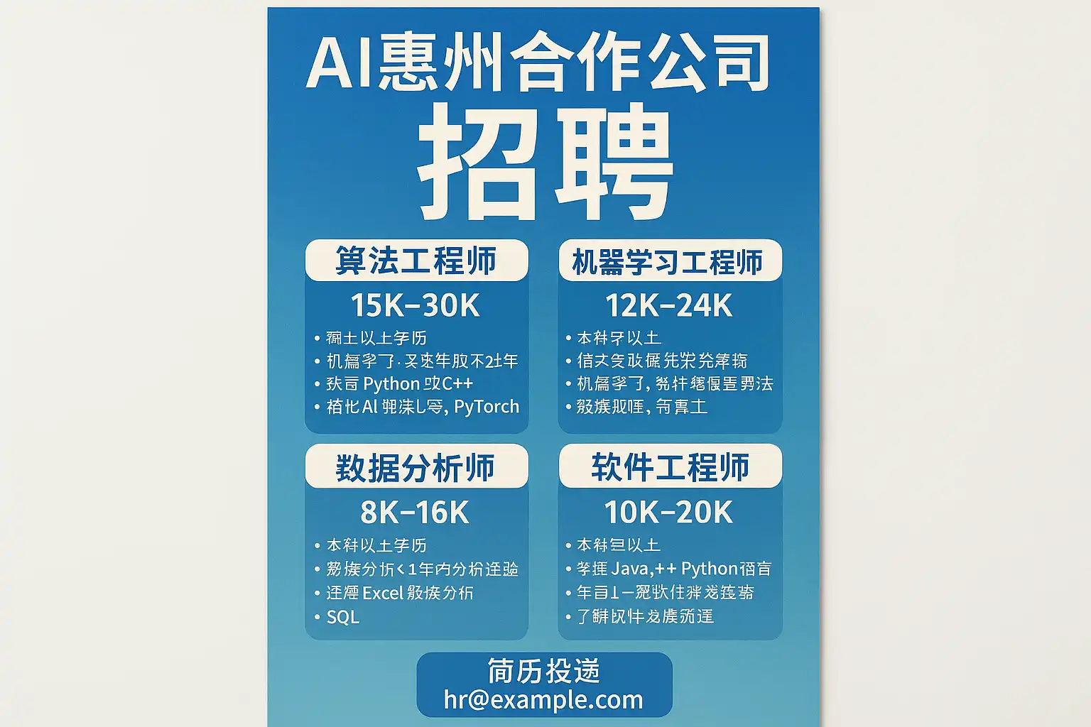- 校园招聘会与行业展会:定期参加惠州本地高校及AI产业园区组织的招聘洽谈会,现场获取职位信息。