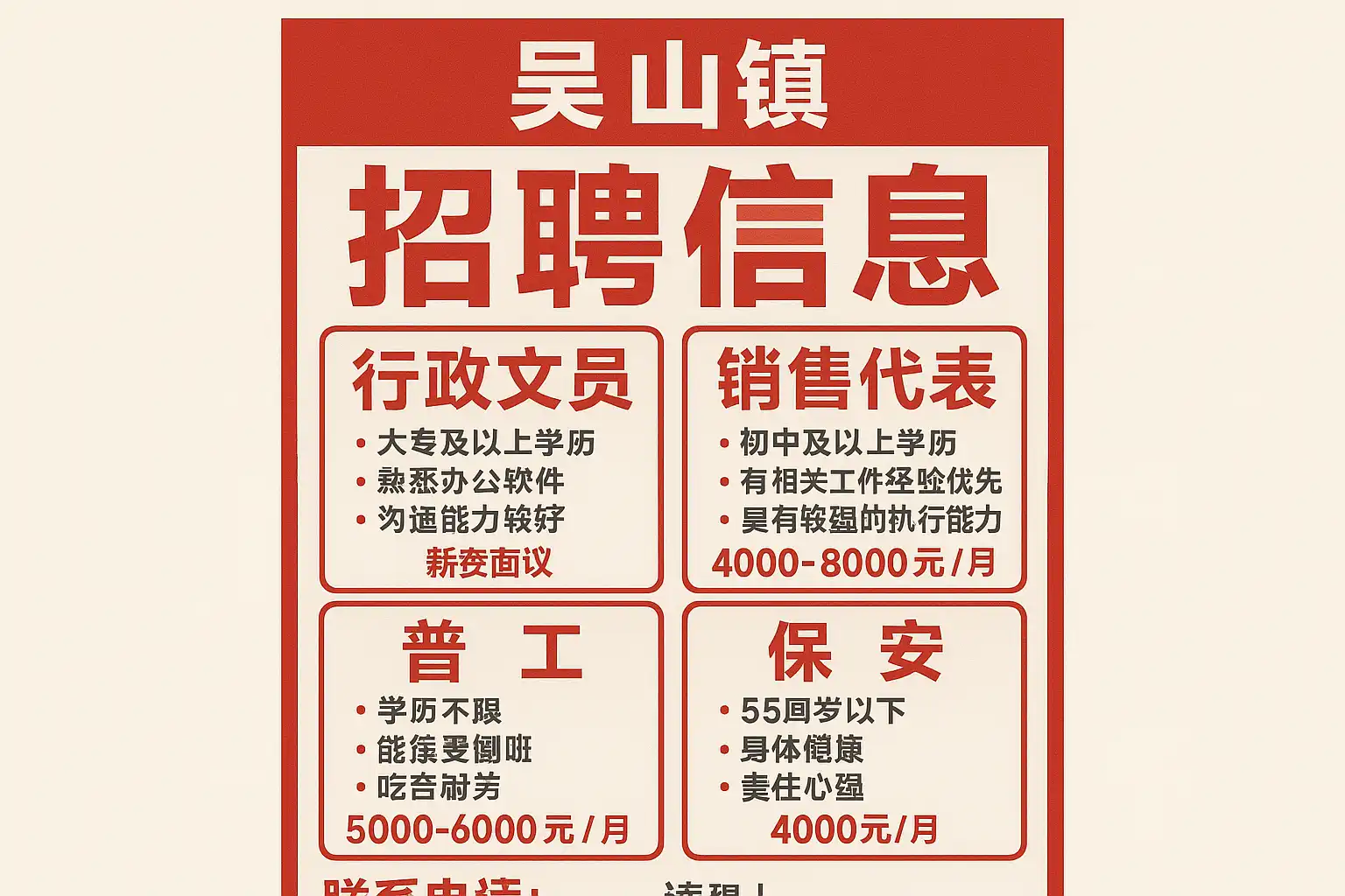 - 开场:您好,我看到吴山镇××岗位招聘,和我的××经历高度匹配,我有××技能,可随时面试,本周可到岗。