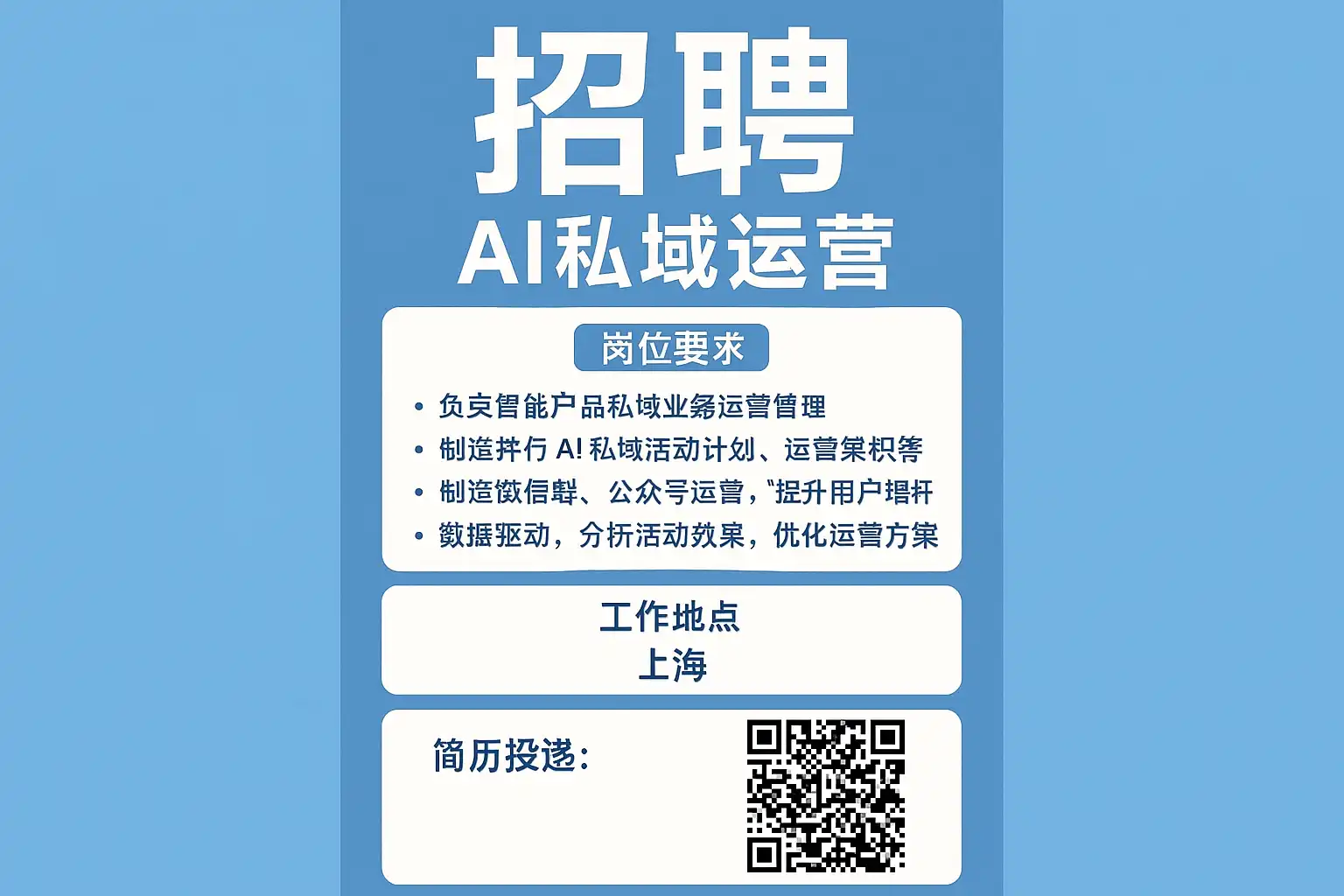 - 必须经验:2年以上私域运营;有AI工具实操;拿得出指标改善案例(提供截图或看板)。