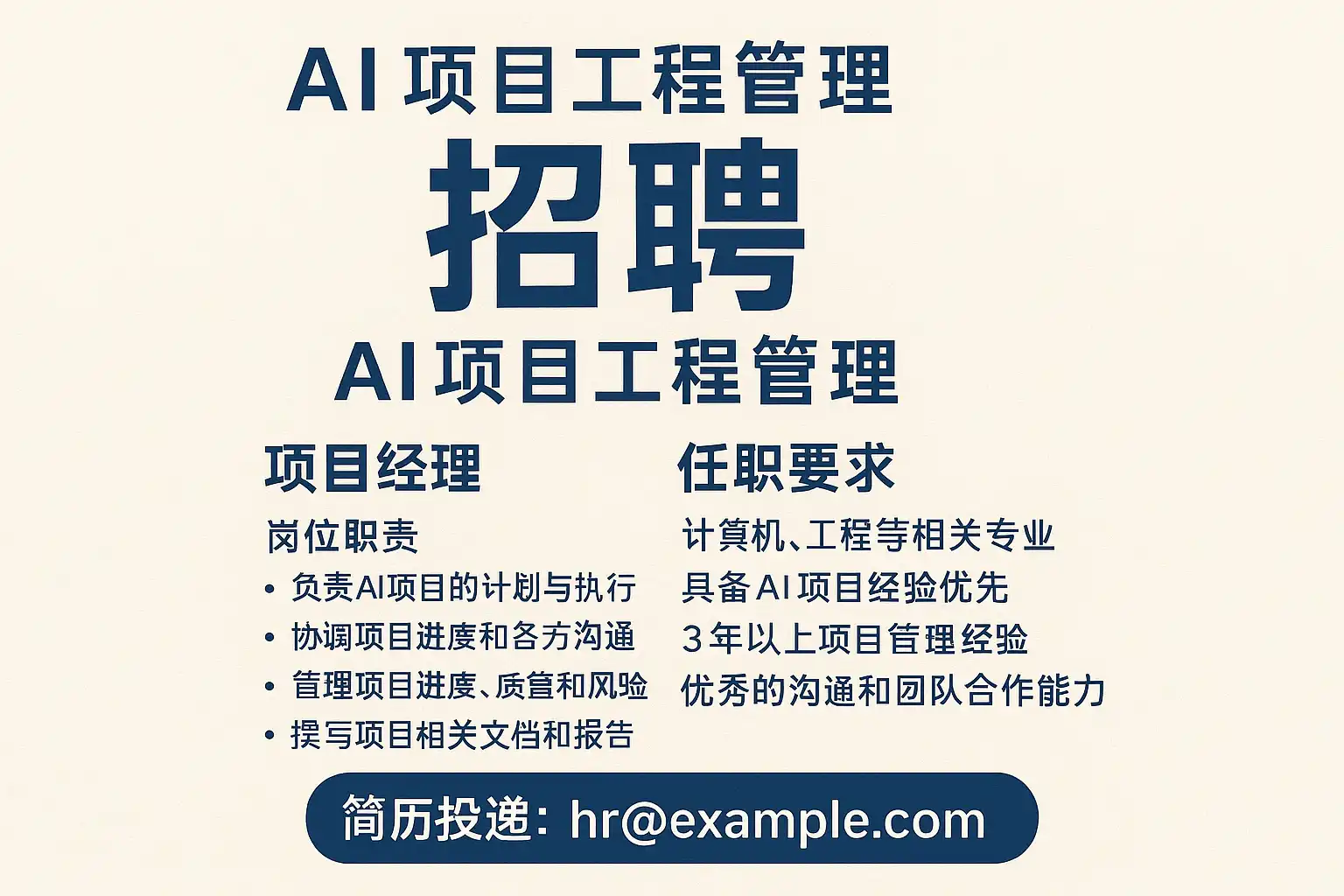 - 技术背景与项目经验:候选人应具备机器学习、深度学习等AI技术相关知识,并有至少3年以上AI项目管理经验。