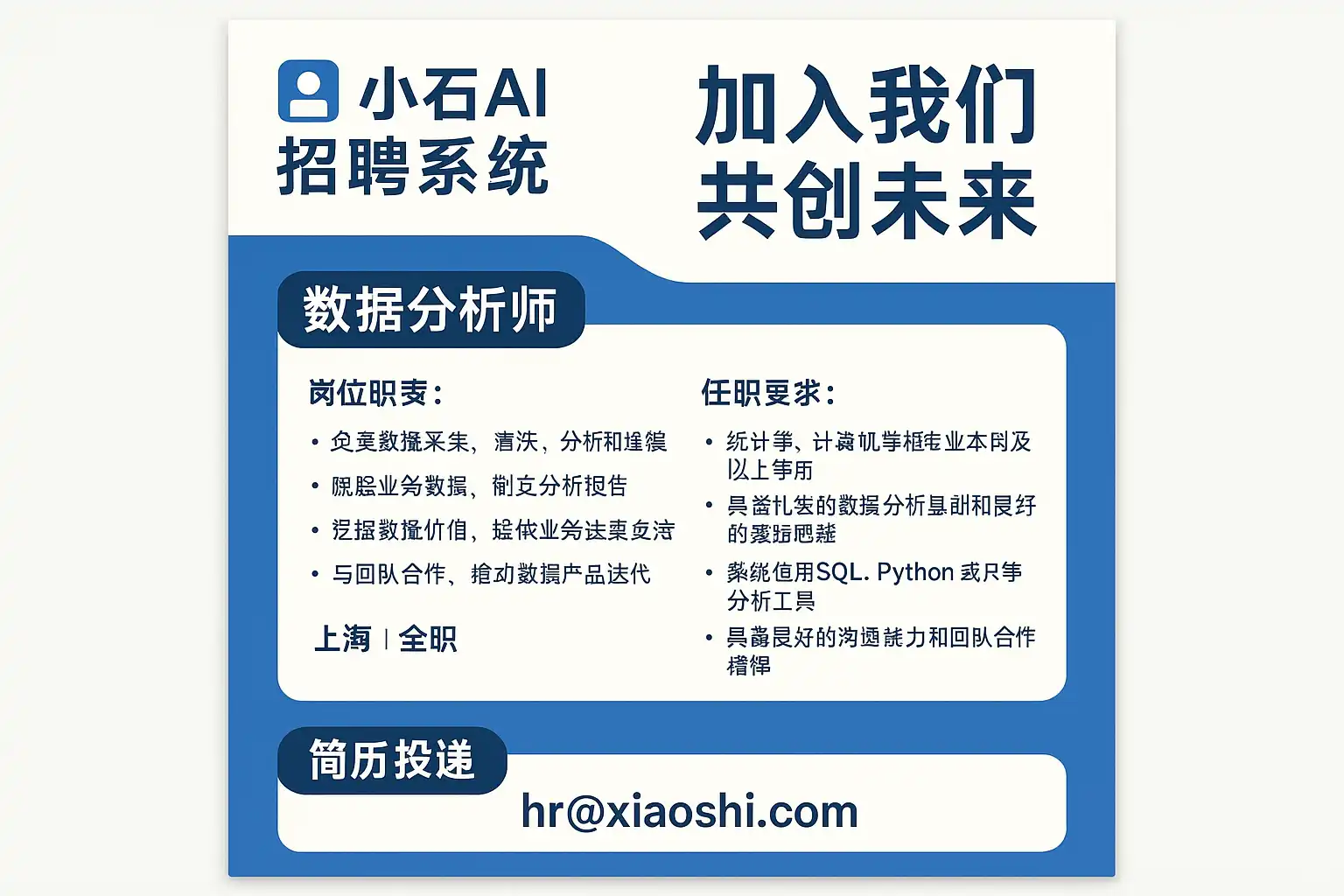 - 小石AI招聘系统:在“找人-选人-约面-评估”链路提效,输出可解释的匹配评分与结构化纪要。