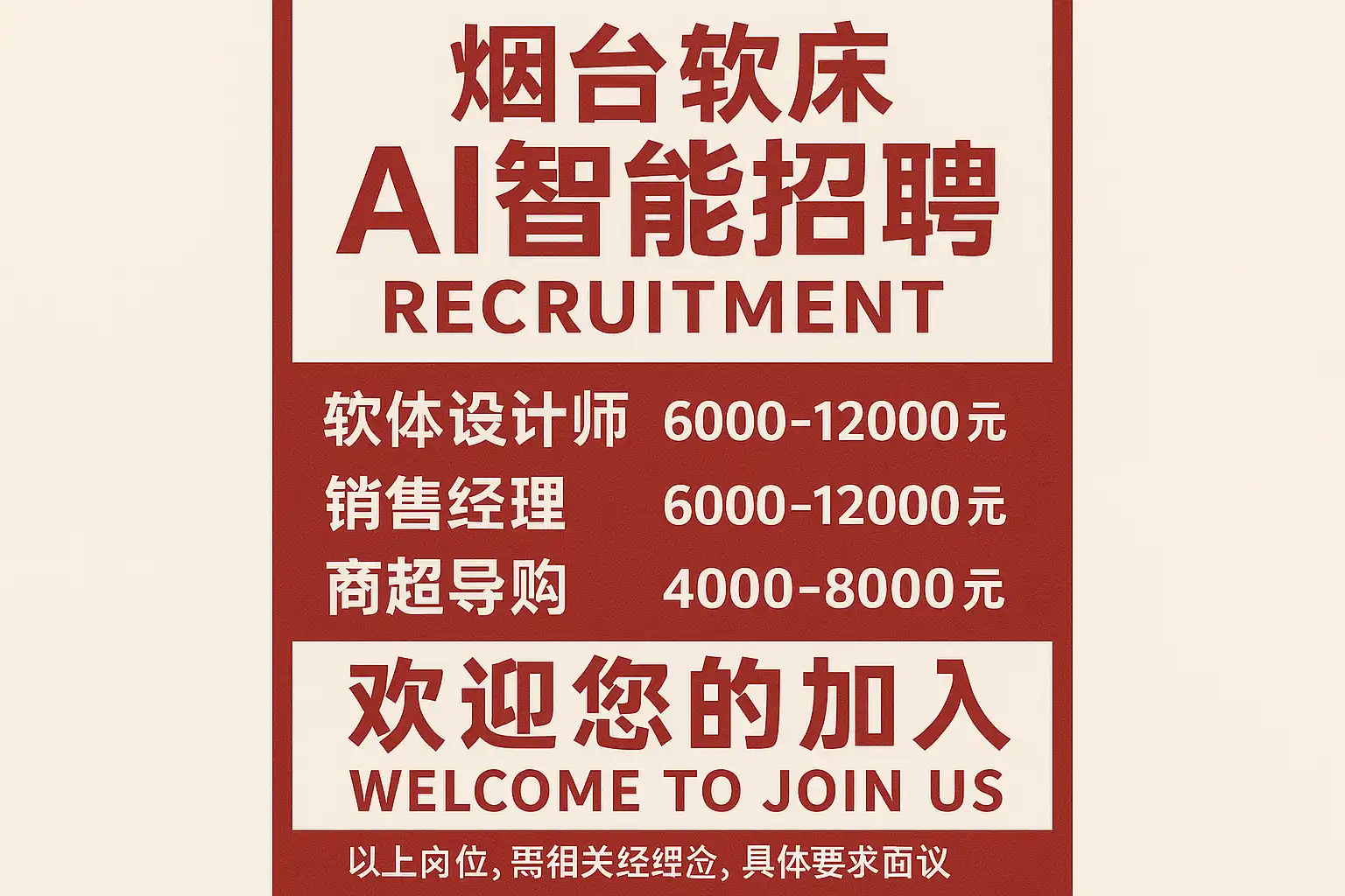烟台软床AI智能招聘目前主推的最新岗位包括: