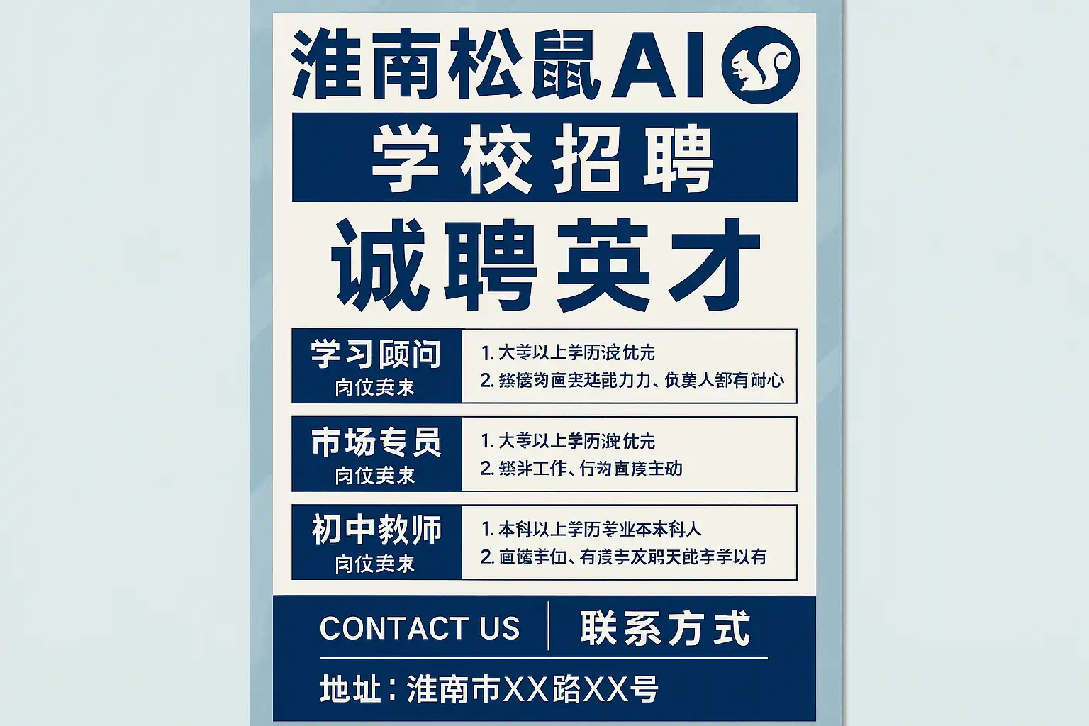 - 第三方平台:Boss直聘/智联/前程无忧/58同城(搜索“松鼠AI 淮南”)。