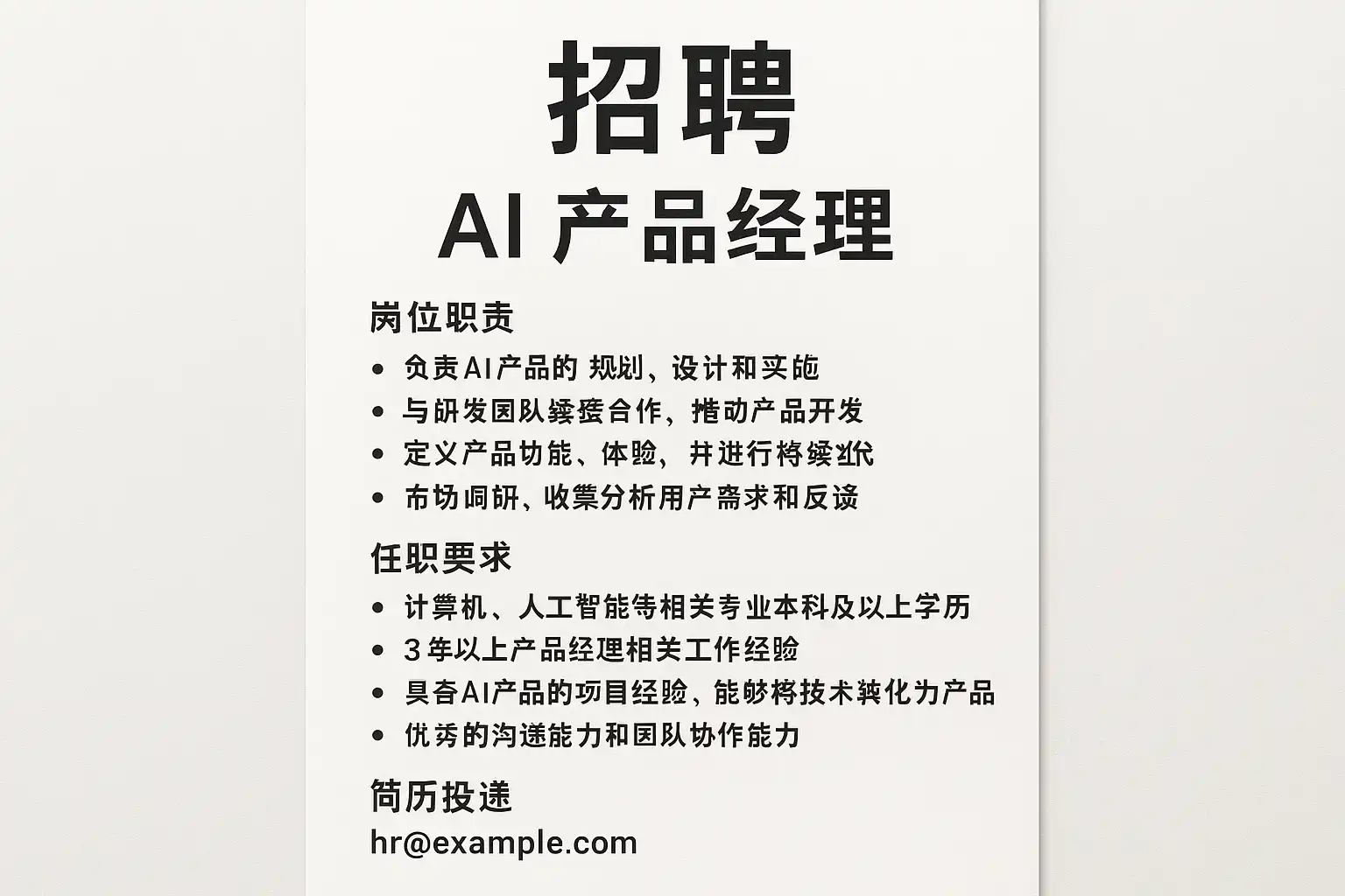 - 多渠道招聘:利用专业招聘平台(如LinkedIn、猎聘)和AI相关社区发布职位。