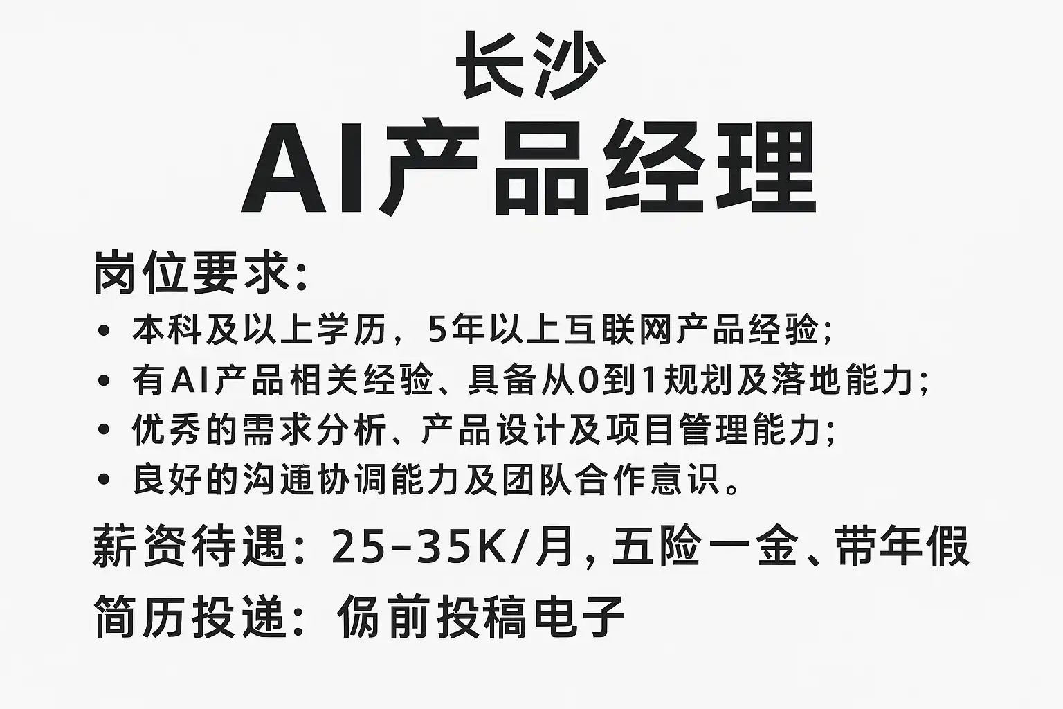 - “AI 产品经理 长沙 AIGC/算法协同/数据中台/模型评测/大模型应用/马栏山/麓谷”