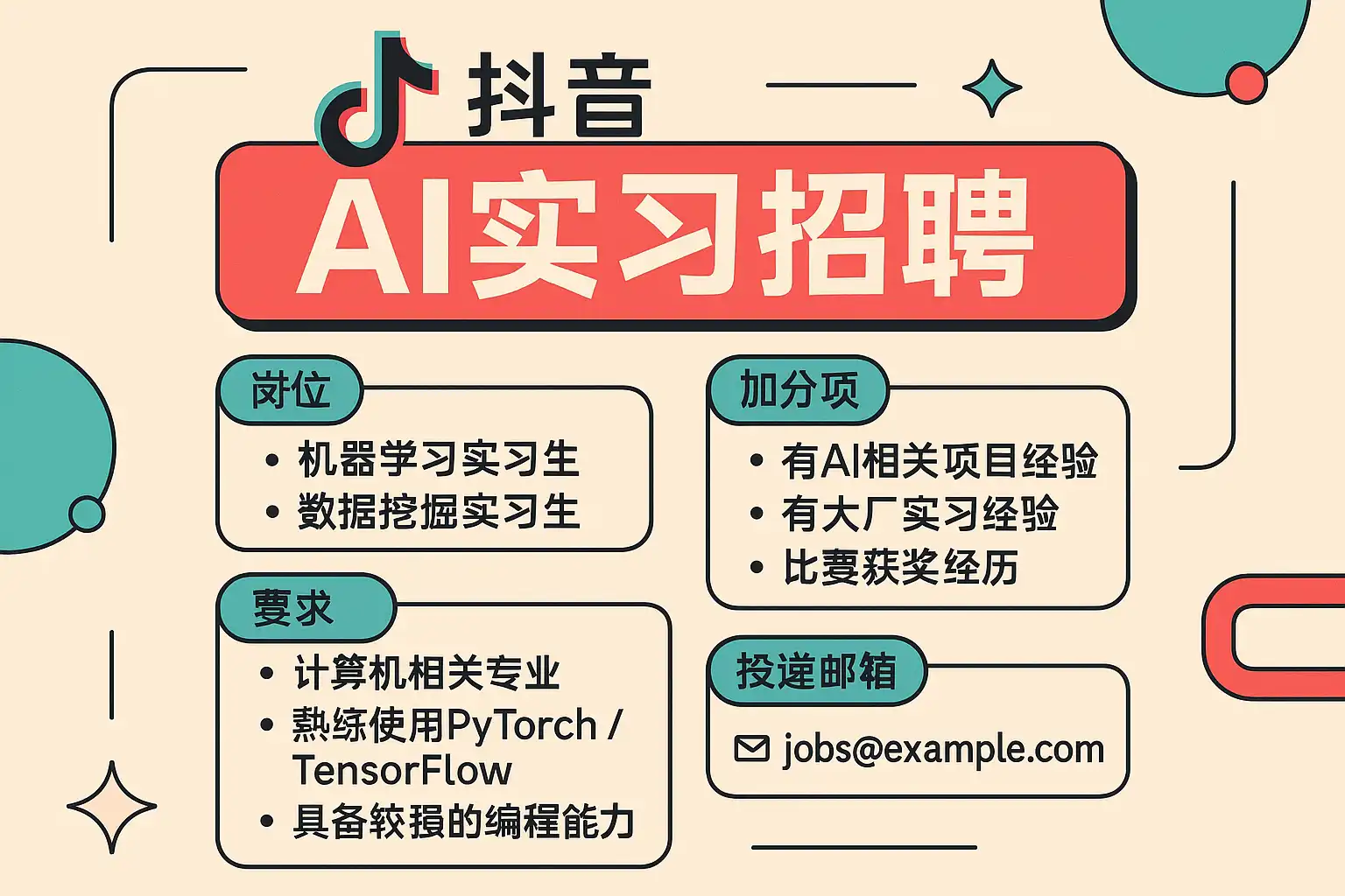 - 抖音AI实习岗位通常通过字节跳动统一招聘发布,方向涵盖推荐与内容理解、计算机视觉、NLP与语音、风控与安全、数据科学与平台工程、分布式与训练平台等。准确识别岗位标签与关键词,是投递命中率的第一步。