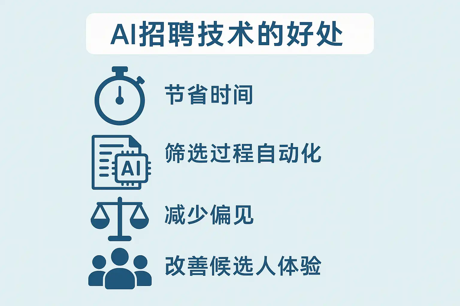 - 消除偏见:减少人为主观判断,提升招聘公平性。