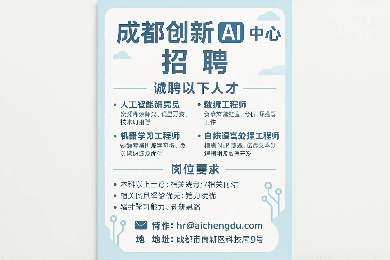 以近三个月成都AI企业与创新中心的公开招聘为参考,常见方向与优先级如下(从“急招/核心业务”到“储备/支持”排序):
