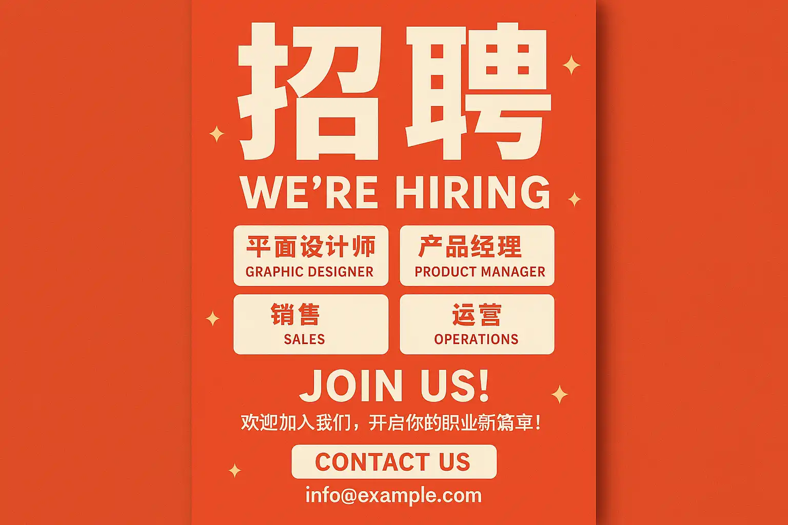 视觉提示词模板: “为‘【岗位】’招聘封面生成主视觉,以【风格】风,主体为【人物/符号】,背景含【行业元素】,突出卖点【X、Y、Z】。构图中心对称/三分法,保留右下角CTA区域。颜色用【品牌主色】+【强调色】,高对比、简洁。避免【噪点、水印、过度纹理】。输出9:16与4:5两版,高分辨率。”