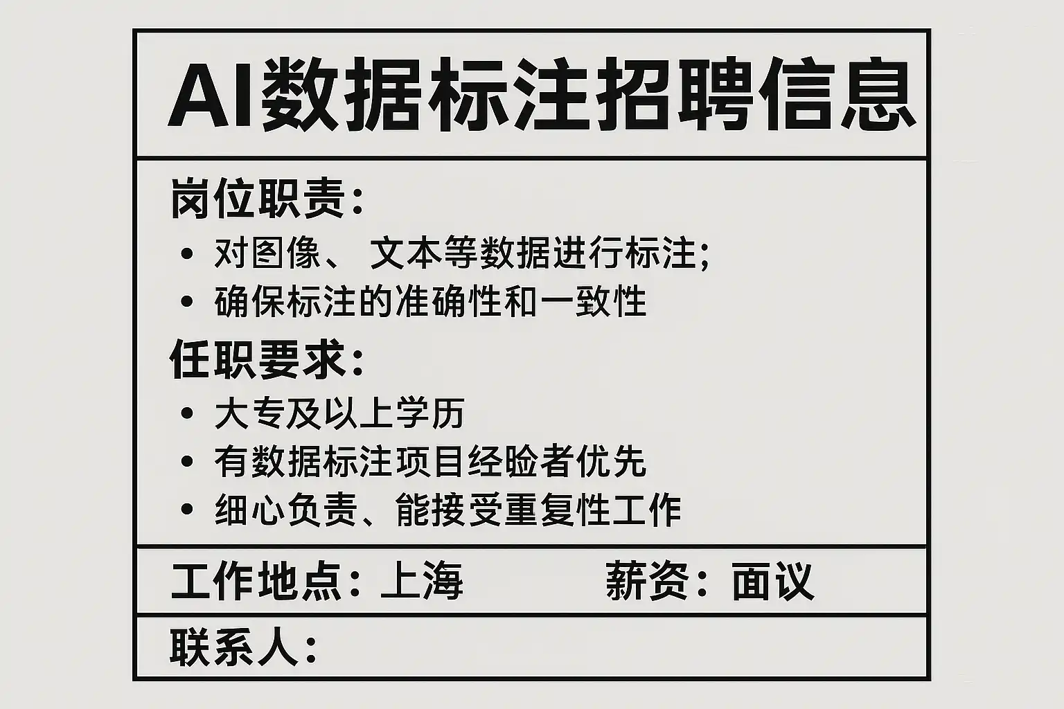- 专业招聘网站:如拉钩、BOSS直聘、智联招聘,设置关键词“AI数据标注”定期推送职位。
