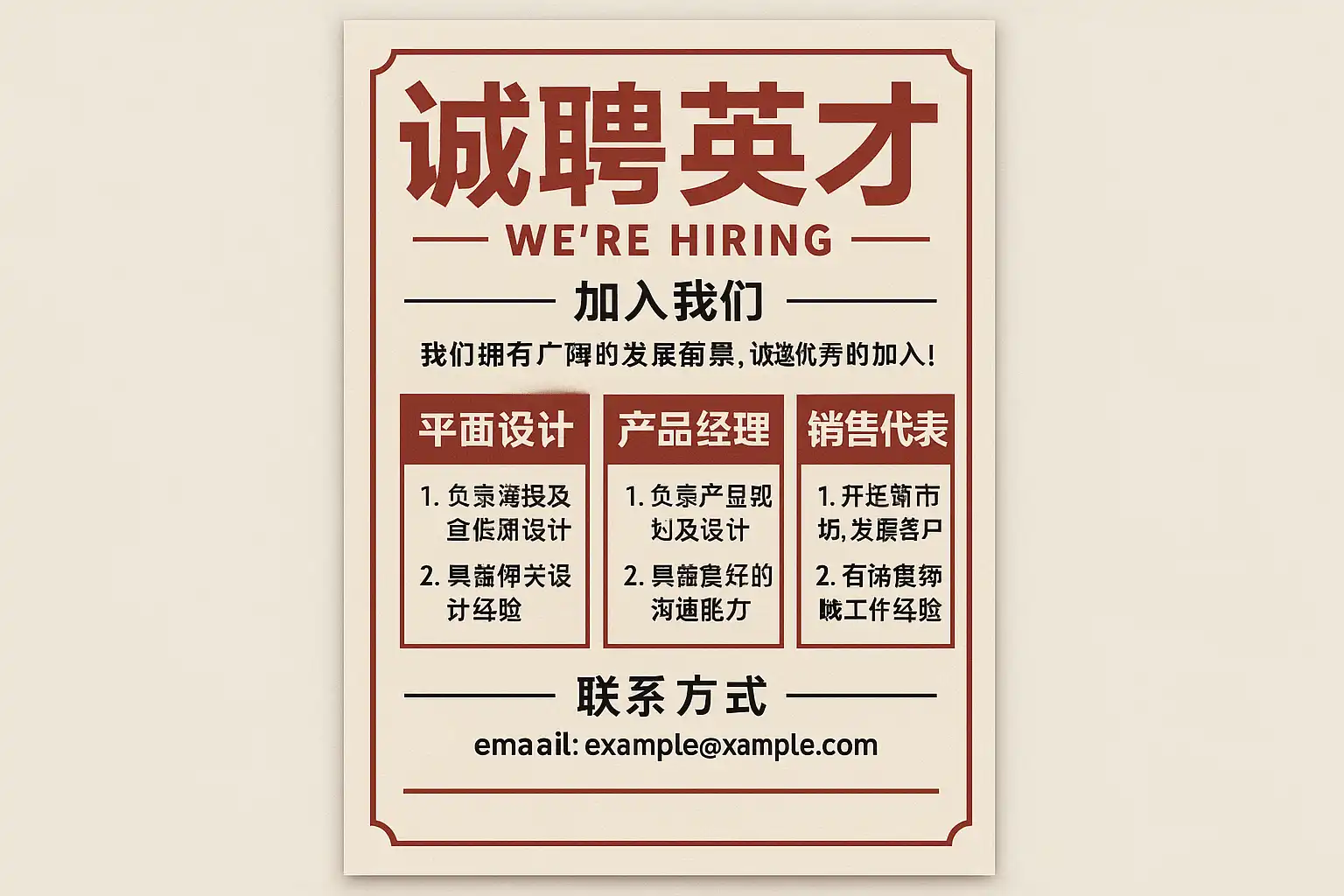 - 目标:让目标候选人3秒内理解“岗位价值”,10秒内做出“扫码/投递”动作。