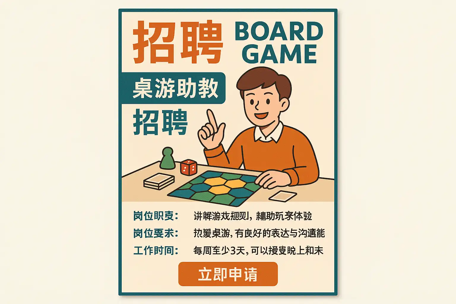 - 目标人群:热爱桌游、表达清晰、善群体引导、基础服务意识强、可快速学习不同机制。