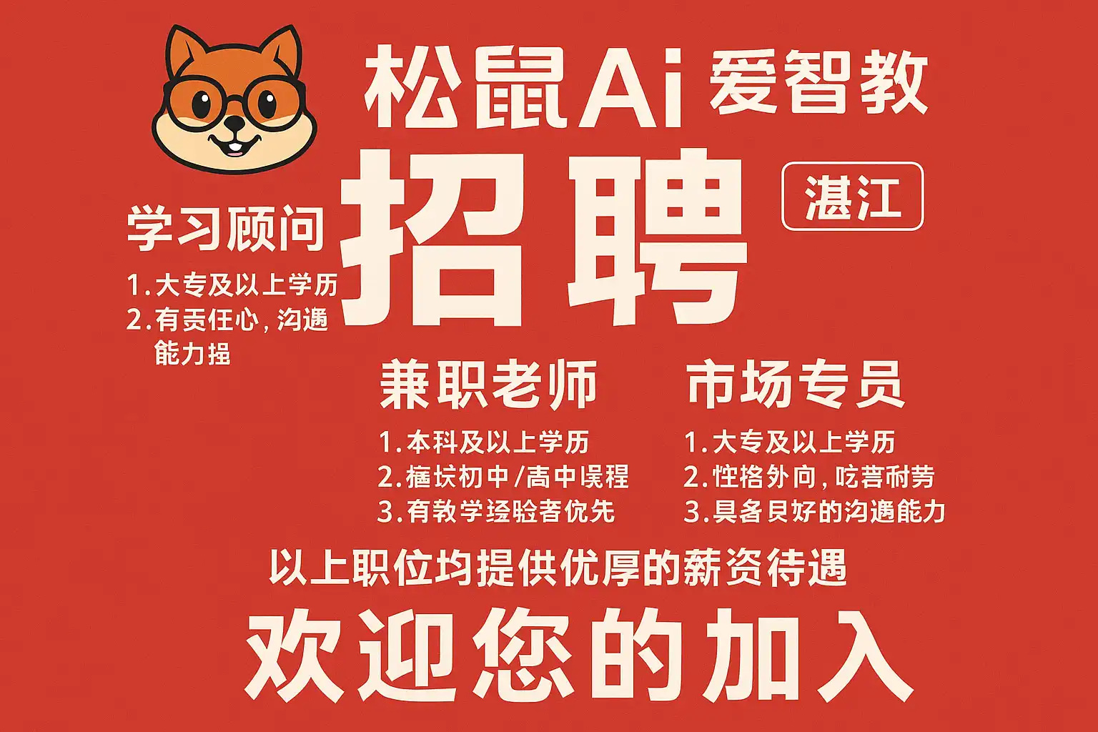 我最近关注湛江松鼠AI的招聘动态,想了解最新的招聘职位和要求,方便我做针对性的准备。湛江松鼠AI现在主要招哪些岗位?招聘条件具体是什么?