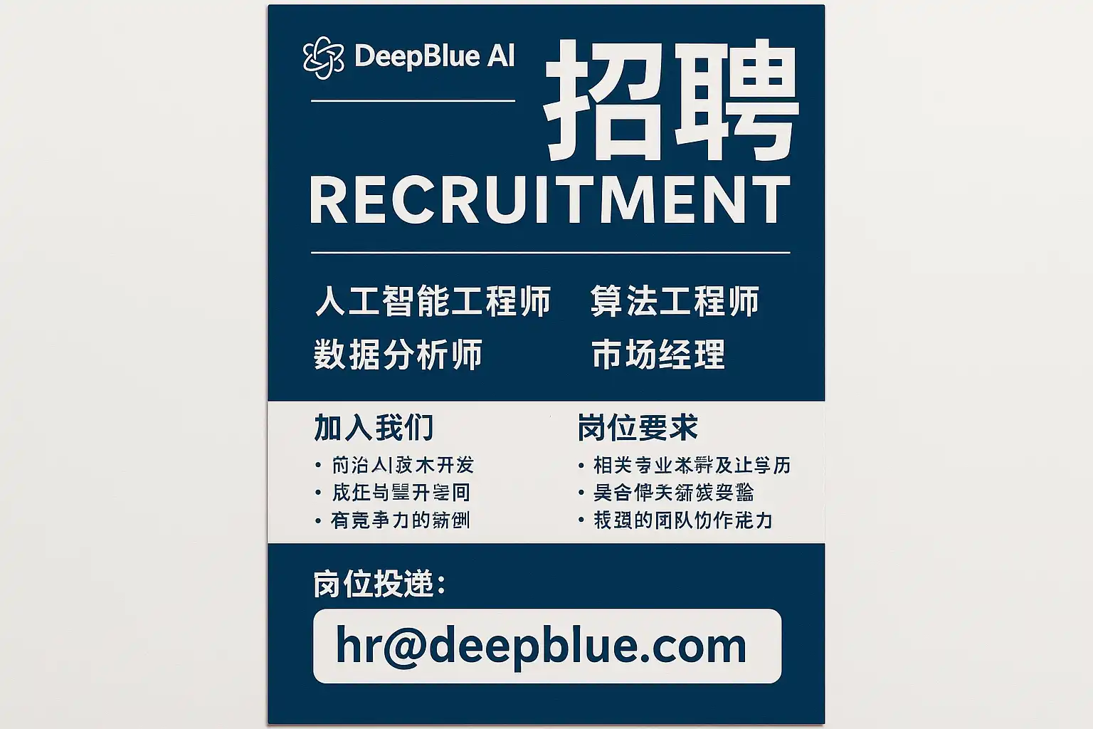 以下为AI公司常见招聘岗位版图与要求示例,供定位“最新职位”与抓住入职窗口参考(具体以深蓝AI智能科技官方发布为准)。