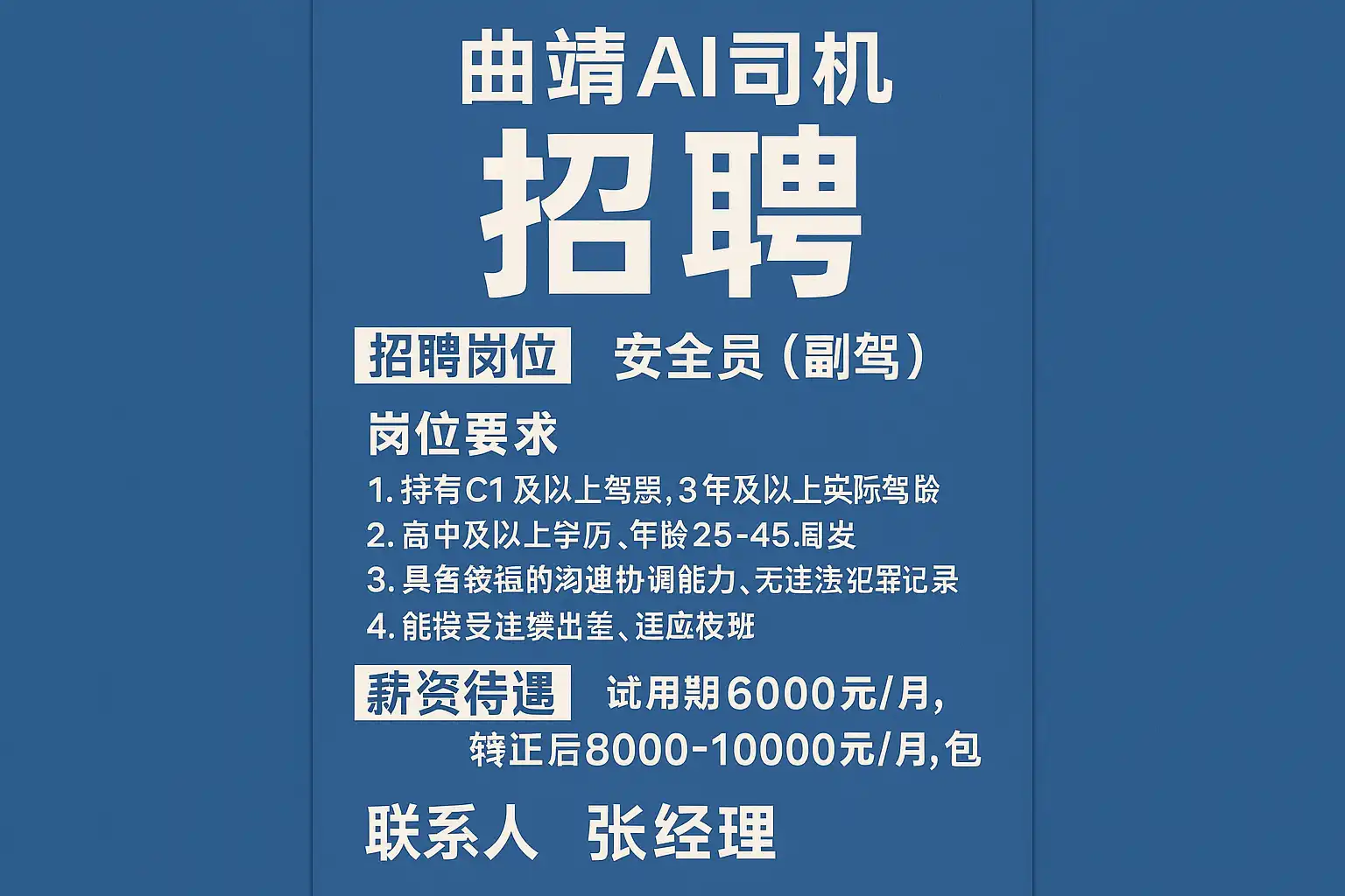 | BOSS直聘/智联招聘/前程无忧 | 日更/时更 | “曲靖 AI司机”“智能驾驶 安全员”等 | 设定职位提醒、1小时内回复 | 警惕非标中介 |
