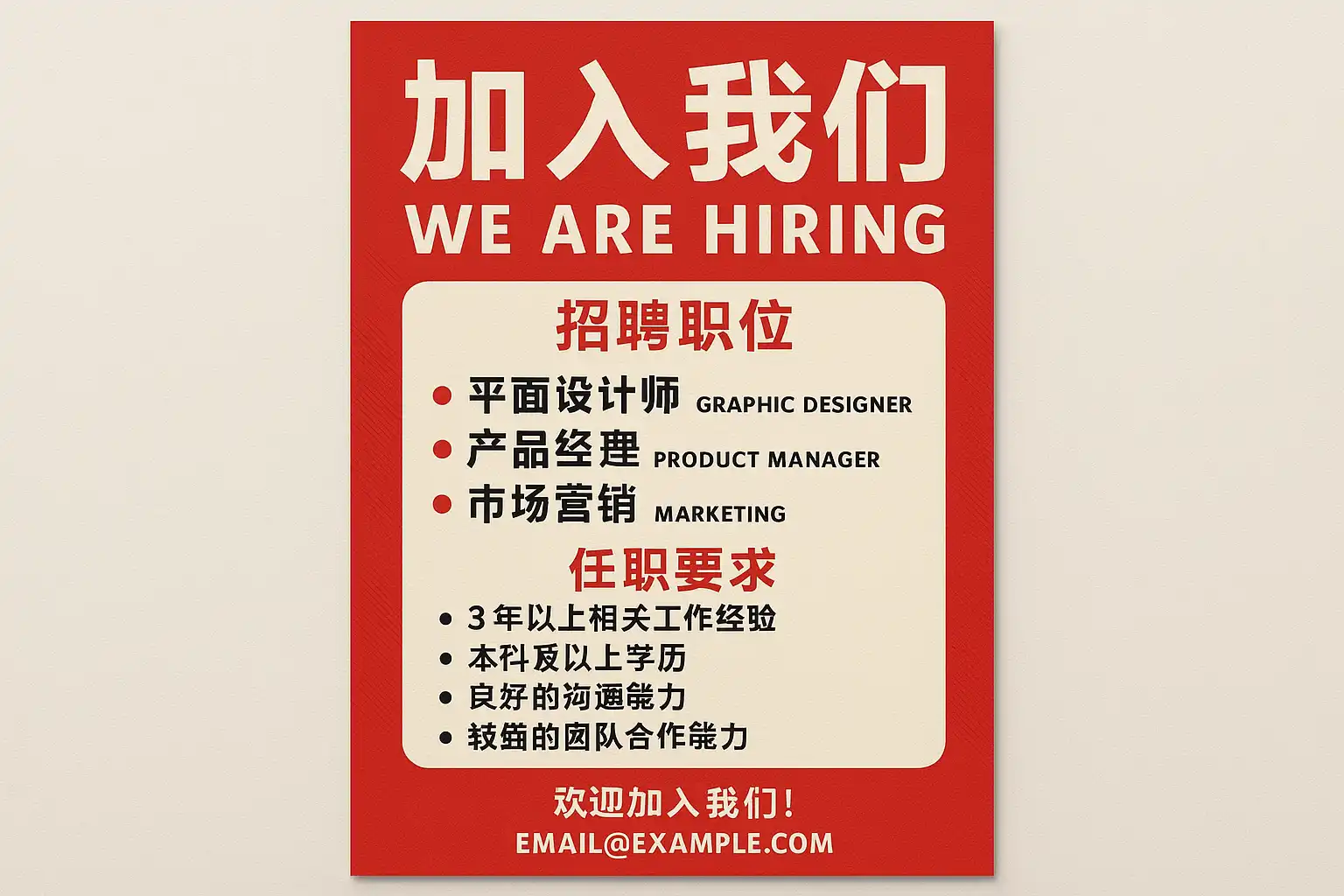 - 选用高对比度色彩搭配,确保招聘信息突出;
