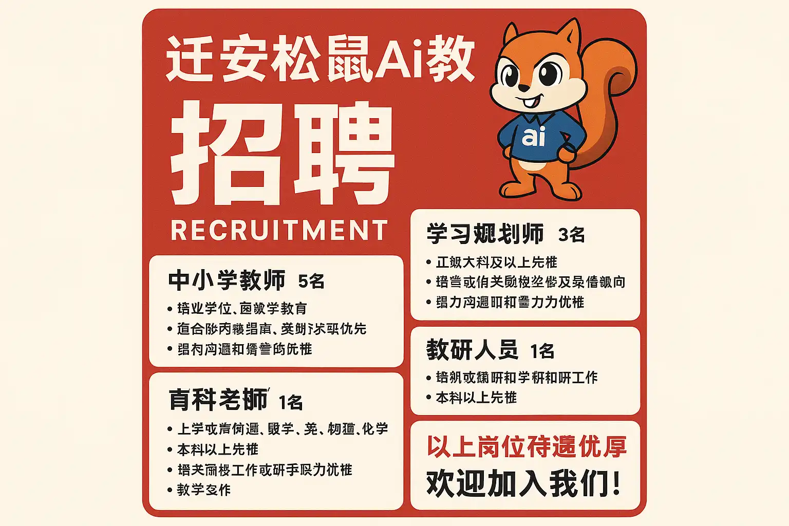 迁安松鼠AI教育目前最新招聘岗位主要包括: