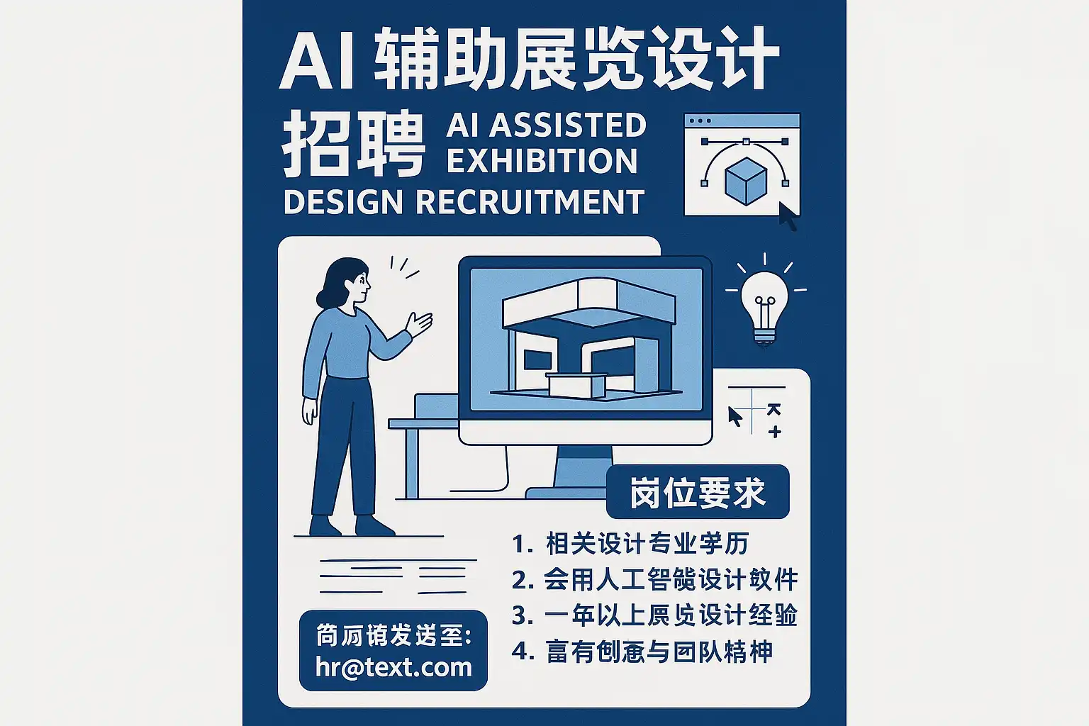 随着AI技术在展览设计行业的深度融合,市场对具备AI辅助设计能力的人才需求显著增长。最新招聘机会主要集中在以下几个方面: