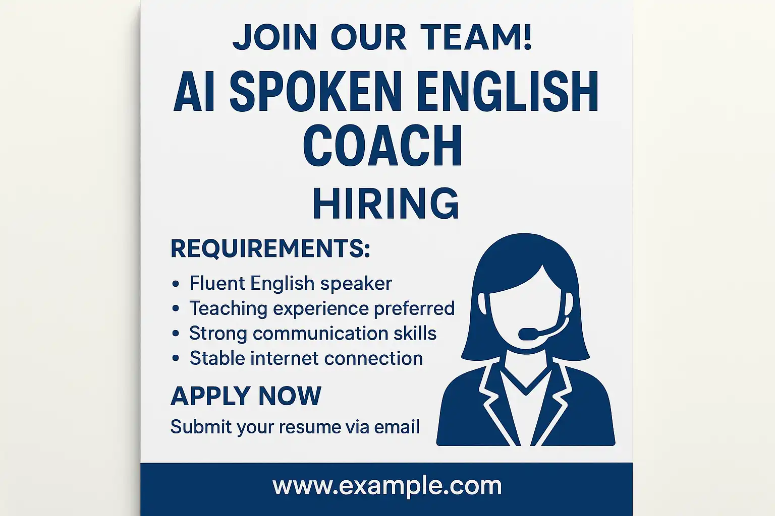 - 中文:“AI英语口语教练”、“语音评测 教研”、“对话设计 英语”、“英语口语 产品运营”、“ESL 教练 人工智能”。