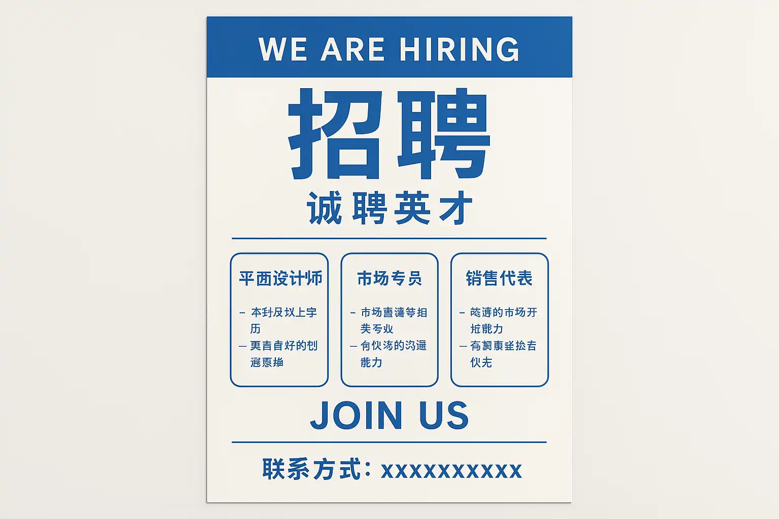 - 重点突出关键信息:用大号字体和对比色突出职位名称和联系方式。