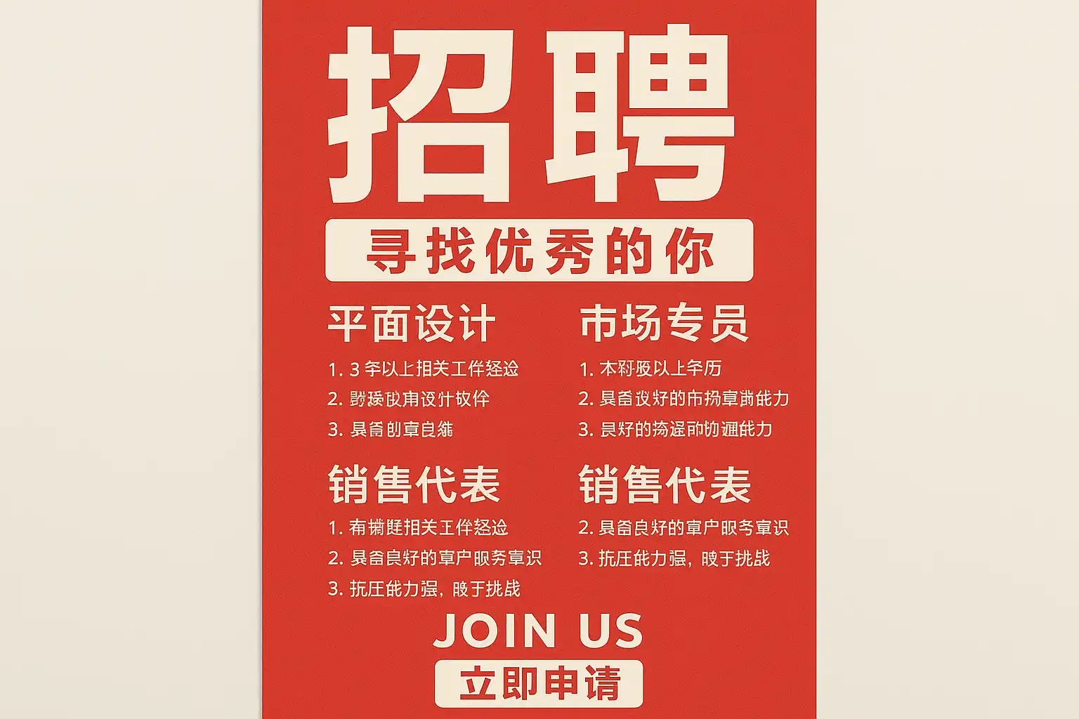 - 若需图内大标题:先用Ideogram生成带“招聘/Join Us/职位名”的图底。