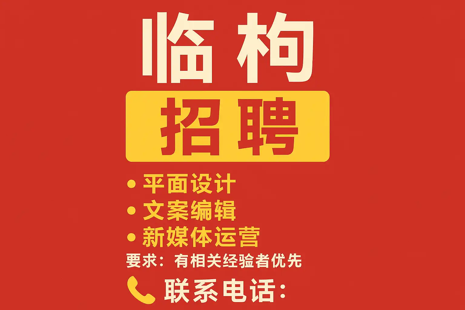 - 临朐AI图文招聘电话:目前无对外统一公开号码,因其可能是区域内多家从事“AI图文/快印/设计+招聘服务”的门店或团队所用的业务名词,具体电话需以该经营主体在官方渠道(地图、招聘平台企业号、公众号、工商登记)公示的号码为准。