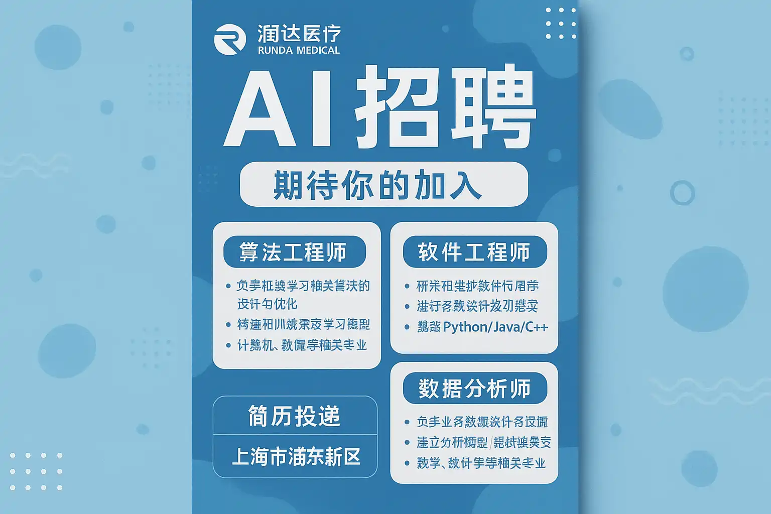 - 主流招聘平台:如智联招聘、前程无忧等,关键词“润达医疗 AI招聘”可精准筛选。