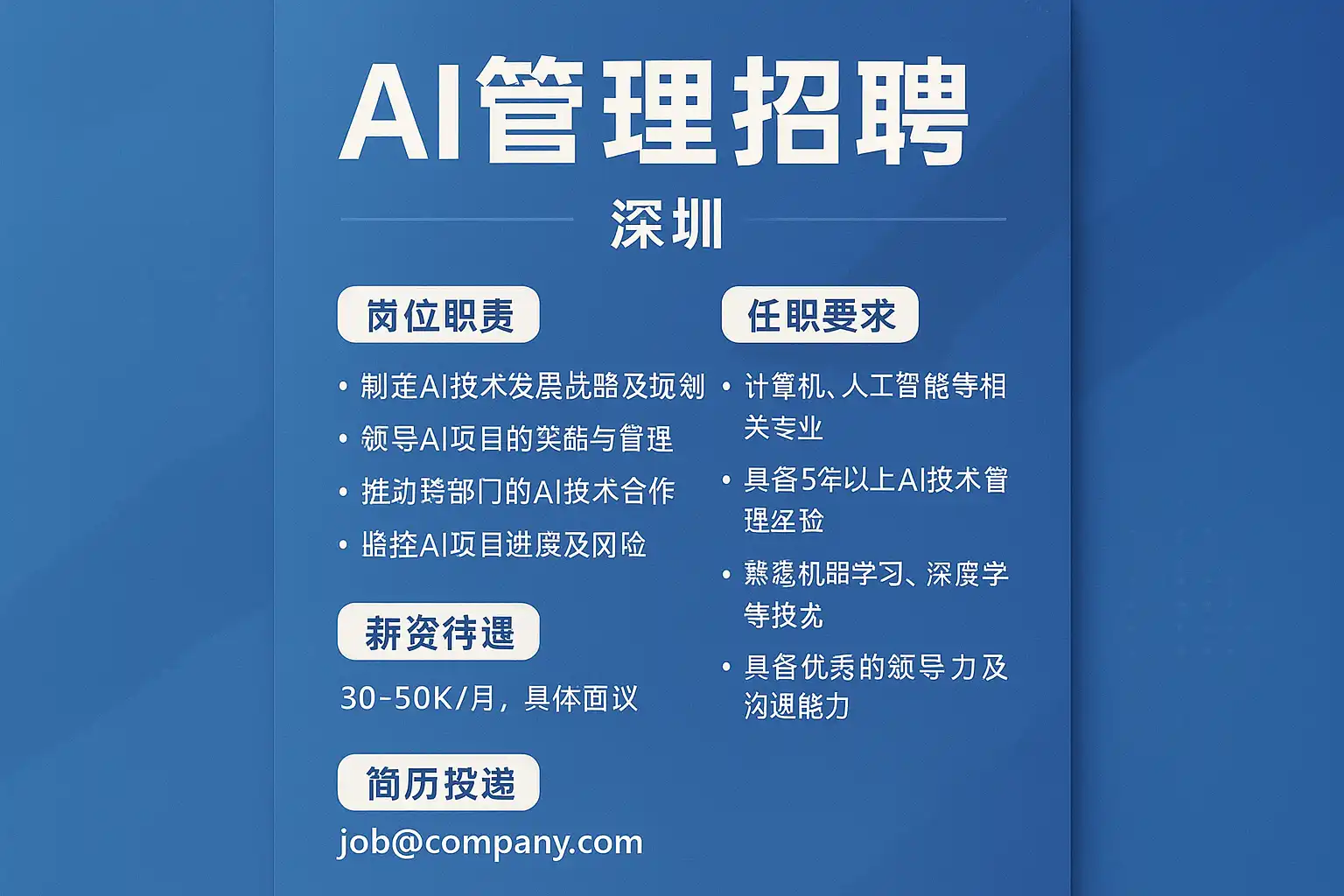 | 薪资水平 | 行业平均薪资对比,深圳AI管理岗位平均月薪约3-5万元 | 某知名AI企业提供5万元月薪岗位 |