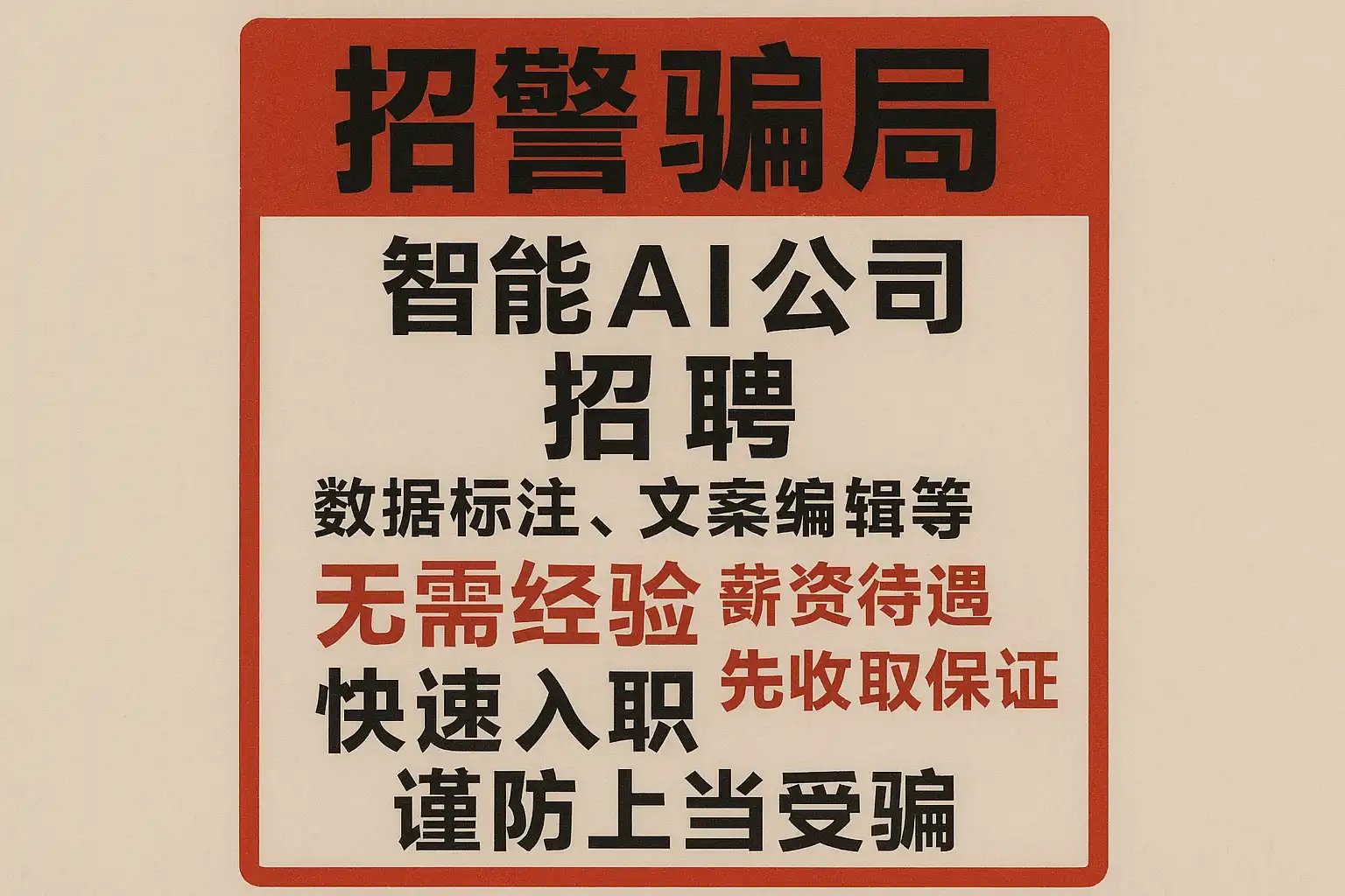 | 虚假岗位 | 发布不存在的AI岗位,描述模糊或夸大能力要求 | 收集个人信息或骗取报名费 |
